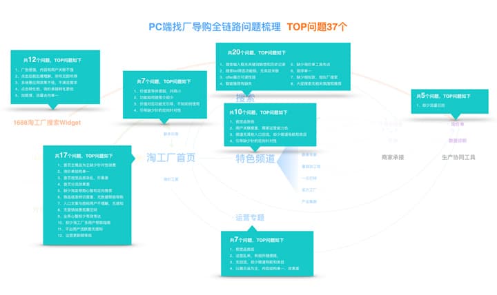 3、梳理业务引流和找工厂的用户导购链路,得到类似于行军打仗的沙盘,建立全局总览视角,这样会发现更多意想不到的收获。以淘工厂pc端部分导购链路图为例,明确了用户开始接触加工定制业务的接触点主要是从1688首页以及主站搜索widget、外部seo等进入淘工厂首页,之后产品开始了用户承接与专属内容的分流,在这个过程梳理中发现专属内容之间缺少再次互通的关系,并且在内容不满足用户的需求时,网站缺少更多真对性的推荐,并且内部业务运营的同学各自拥有各自的阵地,缺少体验和运营的全局观。