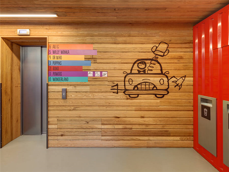 伦敦发电机旅馆的总体创意方向和设计语言强调大胆和令人兴奋的风格,反映了国王十字的区域精神和文化。设计师在室内设计的基础上添加细节,尽可能的利用每个可能的空间,使用明亮的色彩划分区域并且提供醒目的信息说明,独特的手绘风格与墙面、标识系统相结合,创造了一套具有鲜明形象的导视系统。
