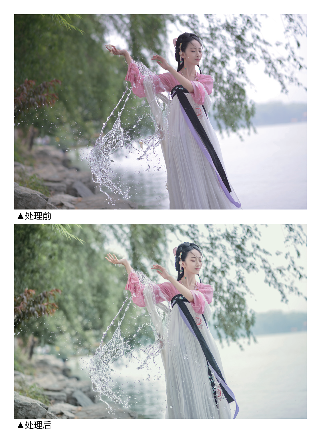 下图避开游人且使用全景构图拍摄,主要展示下垂的花枝和泛起涟漪的水面,风景美如画。把模特放在三分线焦点上,人物轻撑纸伞,似在画中游。因为油纸伞会遮住一部分光,所以模特要微微抬头,防止拍出的脸部发黑。
