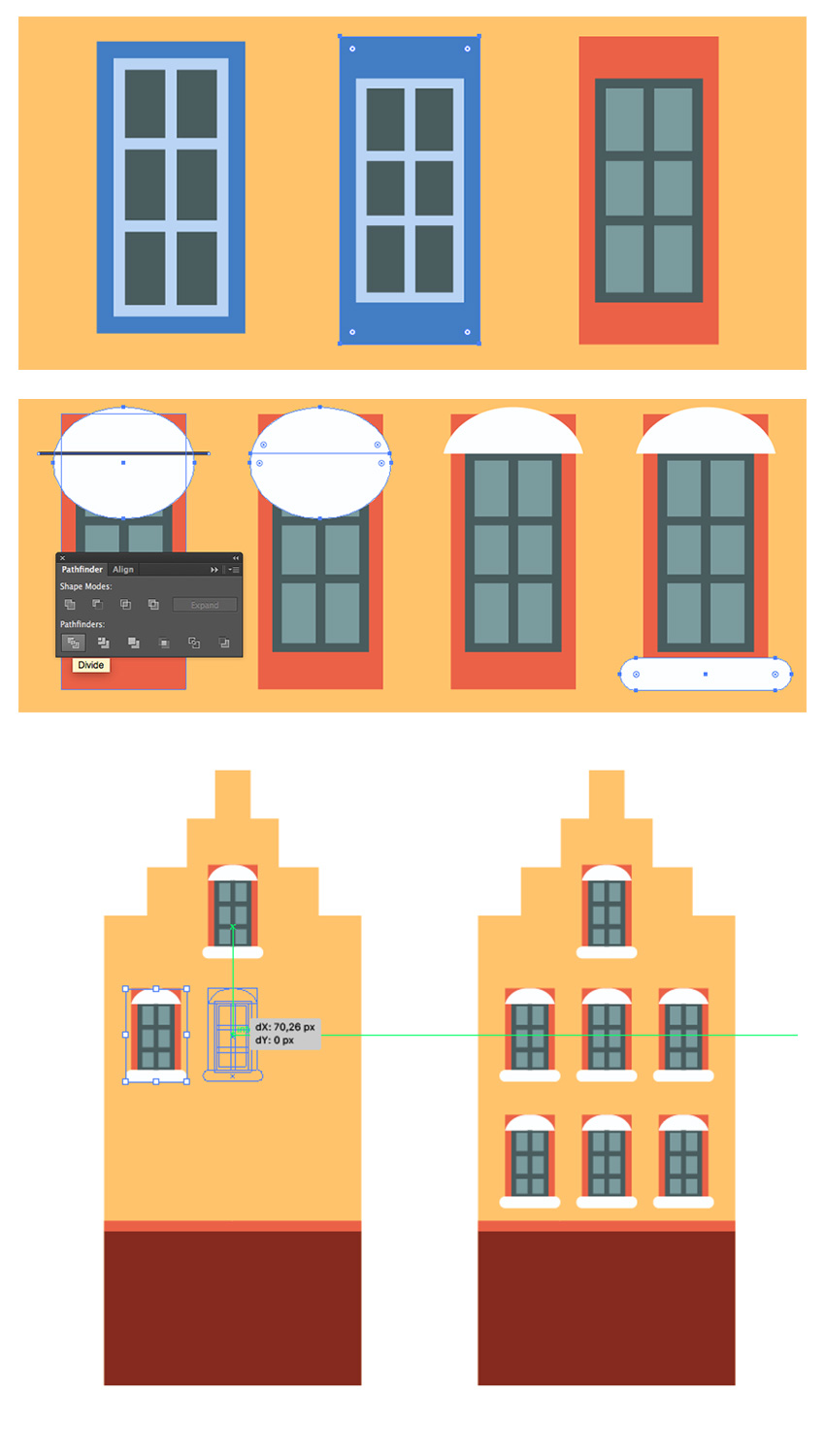 复制第一个蓝色房屋的窗户,并使其外侧部分更宽,同时使窗口本身在顶部和底部边缘更短。改变#e66340红色外部部分,#7c9b9e玻璃和#4a5c5e窗框的颜色。
