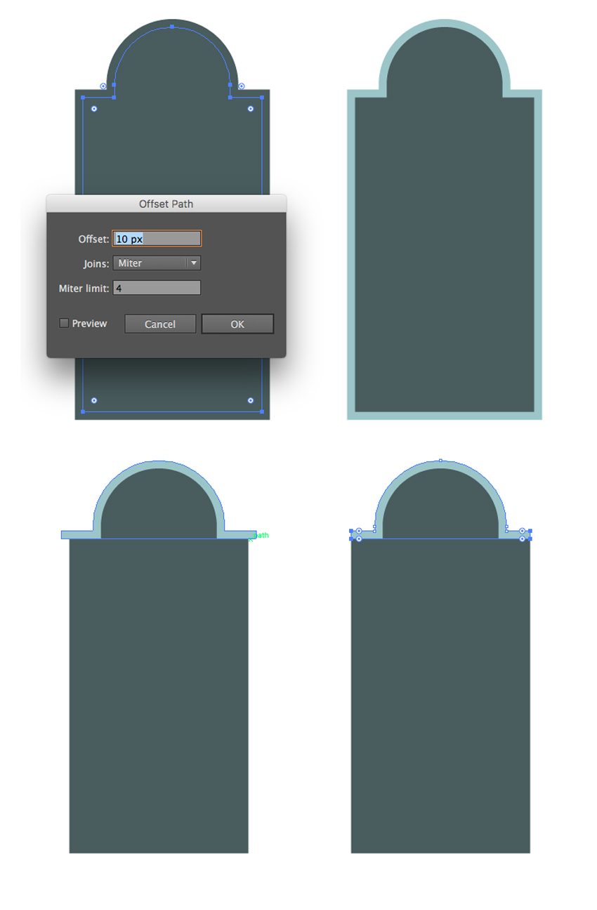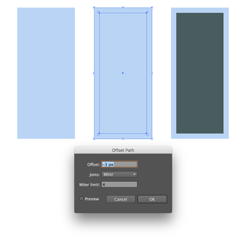选择它并转到 对象>路径>偏移路径。 将偏移 值设置 为 -3像素,在内部添加更小的形状。将形状颜色设置为#4a5c5e。