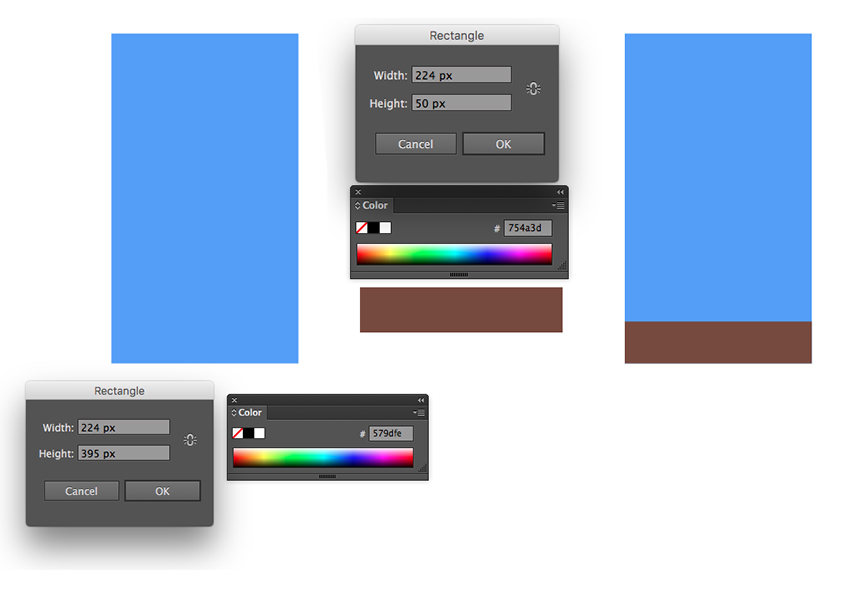 然后 在矩形工具(M)的帮助下创建一个 224 x 395 像素 淡蓝色的 #579dfe矩形, 用于建筑物的主要形状。