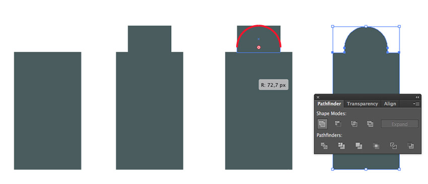 首先制作一个225 x 395像素的矩形的#4a5c5e颜色。再创建一个145 x 90像素的相同颜色的形状,将其放置在较大的顶部边缘上并与其中心对齐。选择两个上角,使它们完全变圆,然后在Pathfinder面板上的Unite选项 的帮助下将两个形状合并为一个。