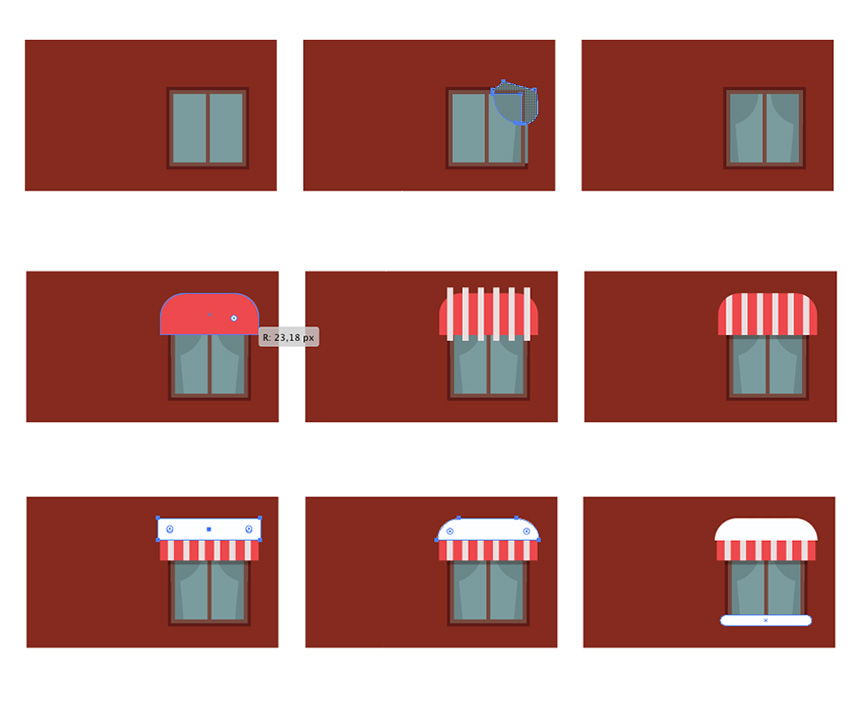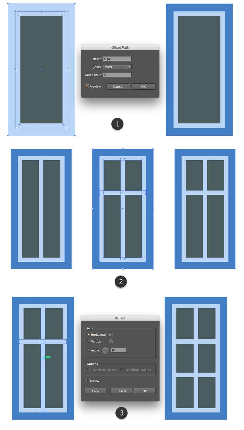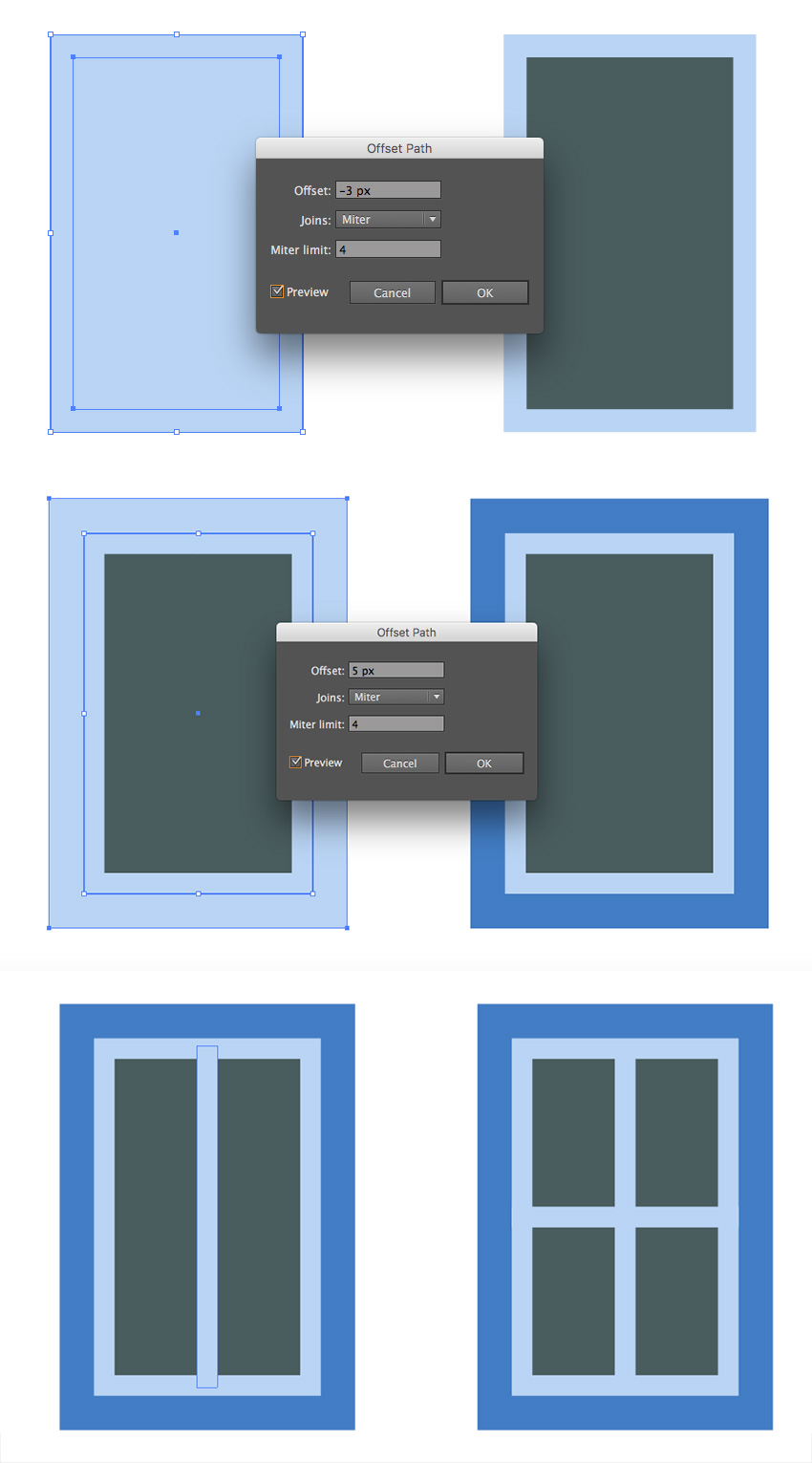 使用“ 偏移路径”选项和与上一步相同的颜色,在窗口中添加深色内部形状,蓝色轮廓和交叉的垂直和水平条纹。
