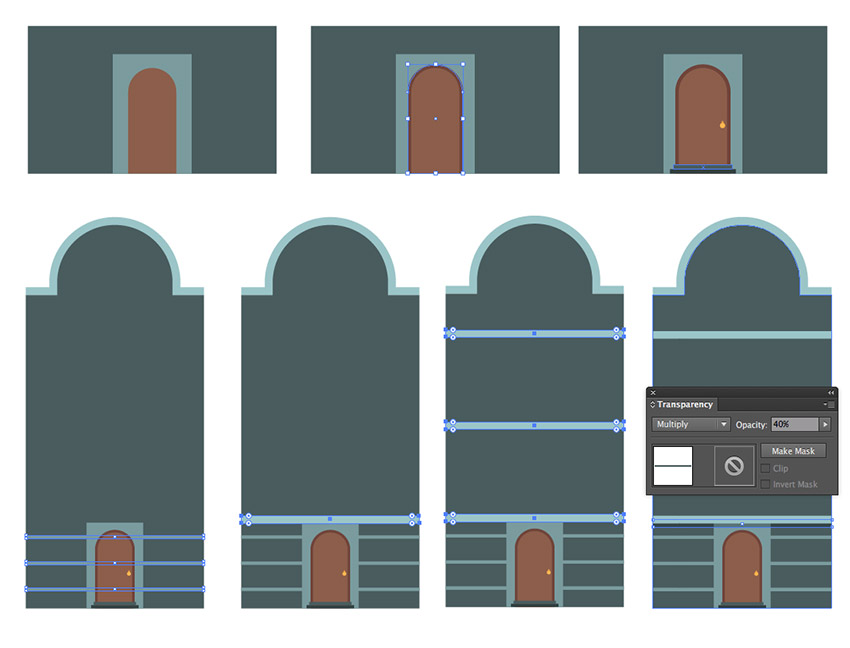 在底部窗台下放置一个柔和的阴影,使立面更加立体。填充阴影形状#4a5c5e,并在透明度面板中将混合模式切换 为正片叠底,同时将不透明度降低 到40%。
