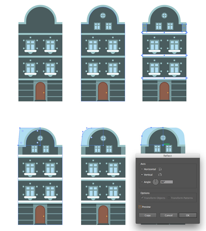拿起钢笔工具(P)#b3def5,为建筑物左侧一半的白雪皑皑的屋顶()创建倾斜的形状。在屋顶角落放圆,并保持选定的形状,在右侧用反射工具(O)单击顶部建筑物锚点,在 右侧创建它的镜面反射。不要忘记将Axis设置为Vertical,最后按Copy,就像我们之前做的那样。