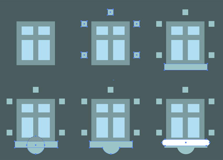 在窗口周围创建小型装饰矩形,填充它们#9ec5c9。在底部的窗台上添加相同颜色的薄水平形状。