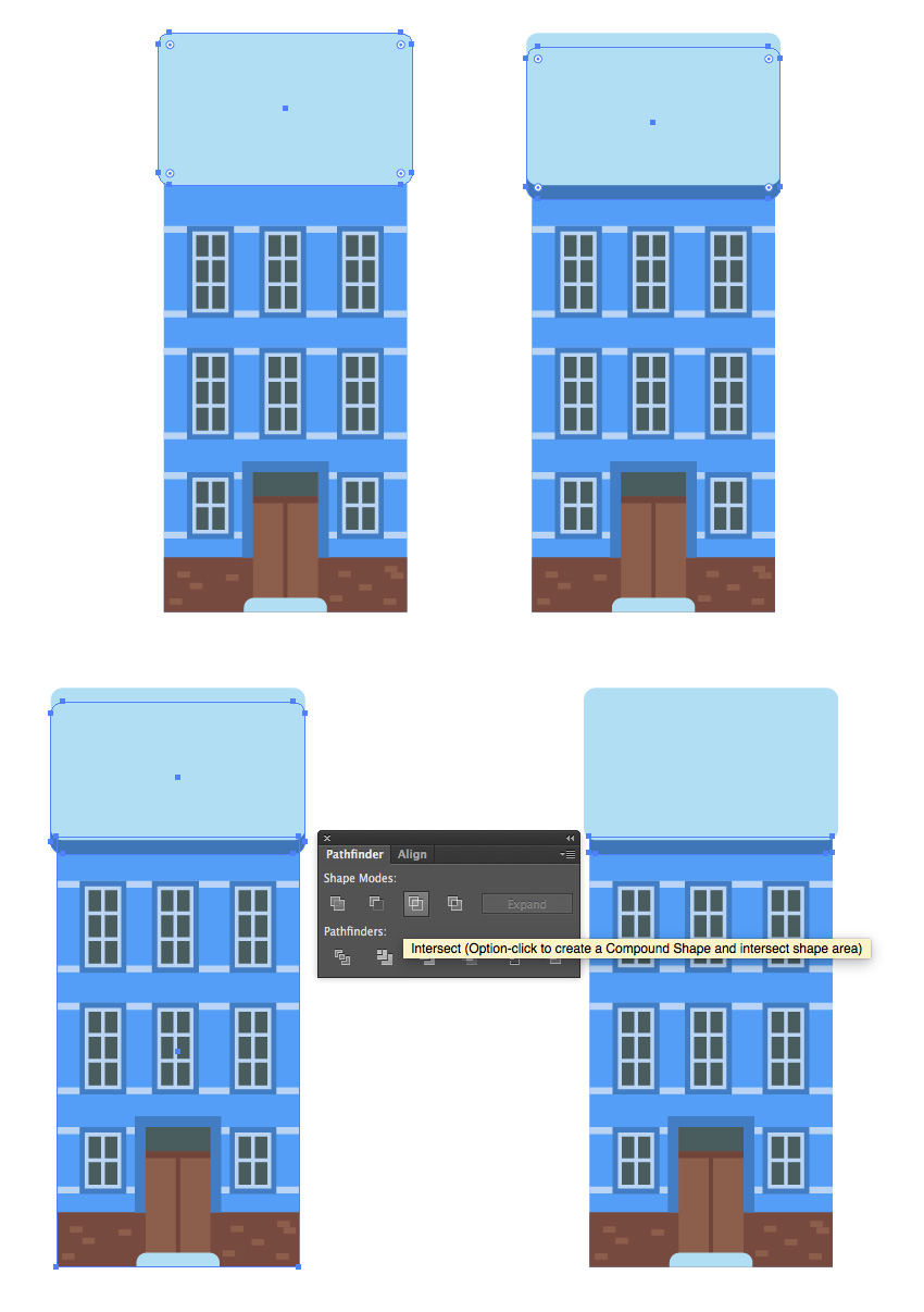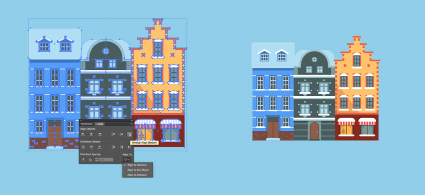 让我们排队我们的房子,并为背景添加一个1200 x 1200像素的矩形(#94cdeb)。使用“ 对齐”面板对齐底部的建筑物。