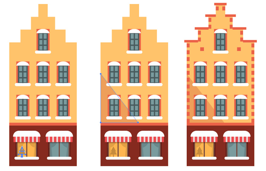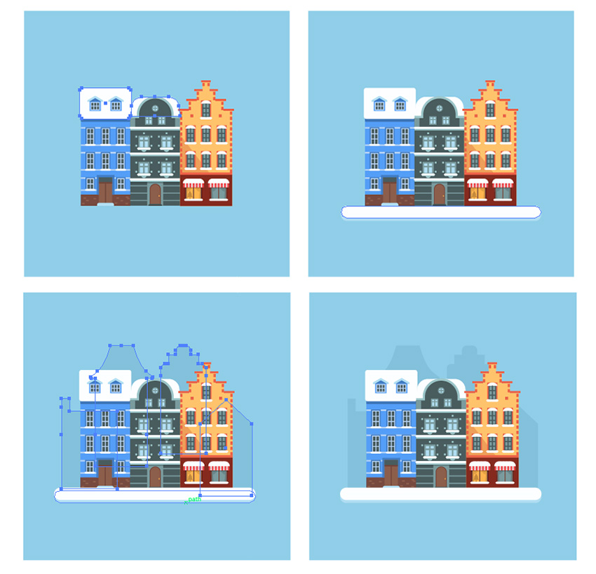 将蓝色和灰色房屋的屋顶颜色更改为白色,为插图增加更多对比。将斜线窗口上的雪帽颜色更改为深蓝色。