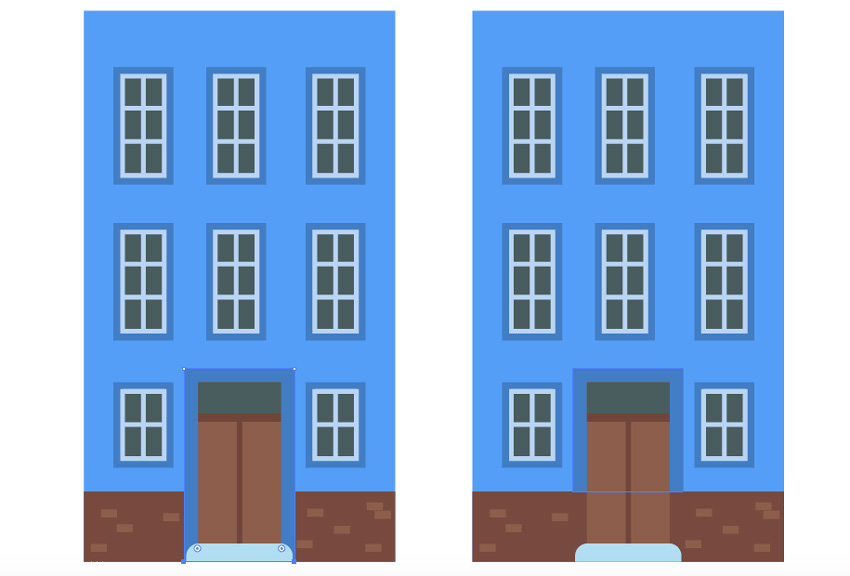 就拿直接选择工具(A) ,并保持Shift键,拖动蓝色门的底部边缘勾勒起来,将其放置在同一水平上的褐色砖部分的顶部边缘。