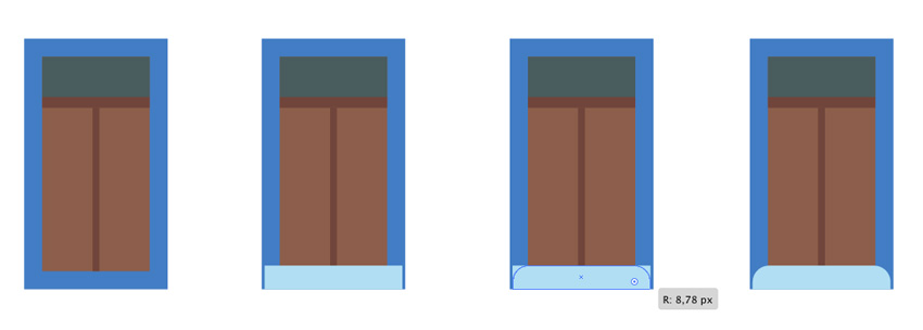 为多雪的门槛建立一个更长的矩形(#b3def5),将它对准门的底部。使用直接选择工具(A)选择两个上部锚点,并将圆形指示器拉到中心,使角落变圆。