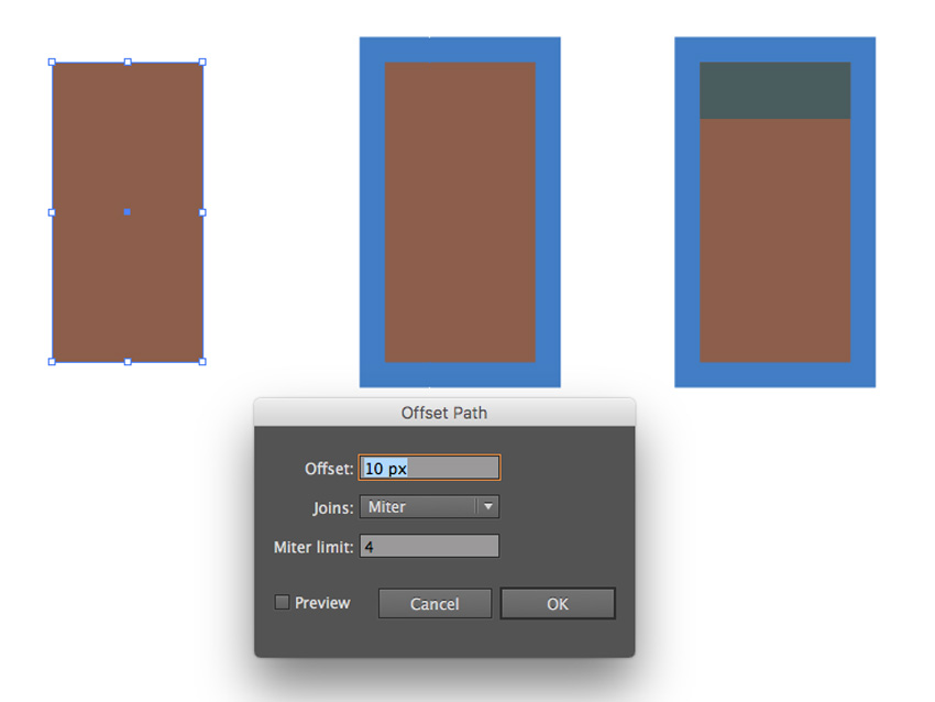 构建一个60 x 119 px的矩形(#8a5e48)并转到对象>路径>偏移路径,将偏移值设置为10 px。将轮廓颜色更改为#447cc9。