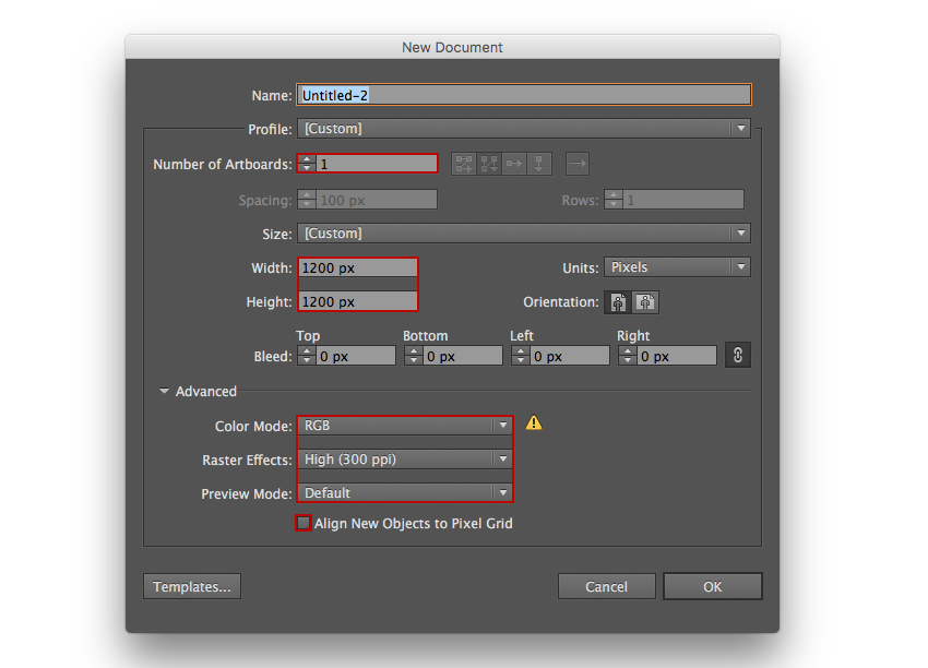 首先,我们需要使用以下设置来设置 新文档 (文件>新建 或 控制-N):