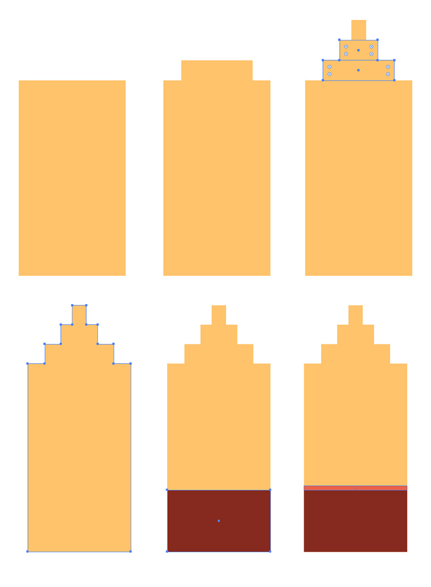 创建一个235 x 430 px矩形的#ffc45c颜色。通过在顶部边缘放置一个水平矩形开始形成屋顶,使其在边缘处变短。再添加两个矩形,一个在另一个之上,使每个矩形比前一个更短。