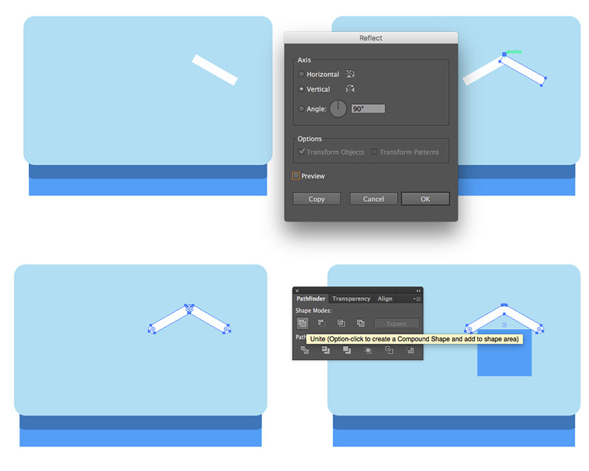 只需创建一个窄的白色矩形,然后按住Shift键进行旋转。取 反射工具(O),然后 按住Alt键并点击 我们形状的顶部锚点。在“ 旋转” 面板中,将角度设置 为90° ,然后单击 复制 按钮。使两个形状完全圆形并将它们靠近彼此。使用Pathfinder的Unite选项 将圆角矩形合并成一个形状 。这个形状将作为我们窗口顶部的一个雪帽。