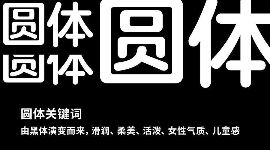 圆体是由黑体演变来的,与黑体的差别只是笔画末端与转折的特征更圆润而已。圆体具有滑润感,柔美而有女性气质,在粗字重状态下也显得活泼而有儿童感。
