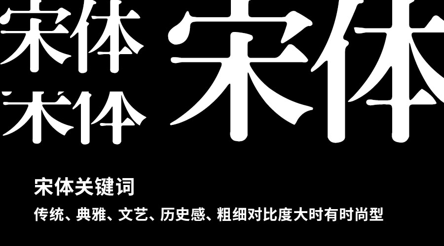 宋体在宋代出现到明朝才成型,传统而具有历史感,也能够表现典雅和文艺的感觉。在粗细对比度极大的情况下也有时尚感,如方正风雅宋和日本的光朝体,除了典雅还具有时尚气息。