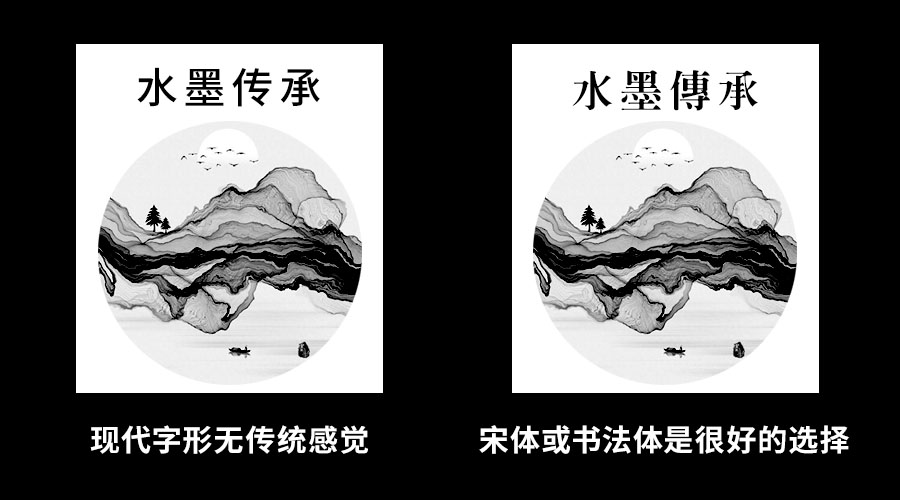 同样的,黑体字形比较现代,不适合表现传统的主体;相反宋体字形和书法体则能很好的表现传统的主题。