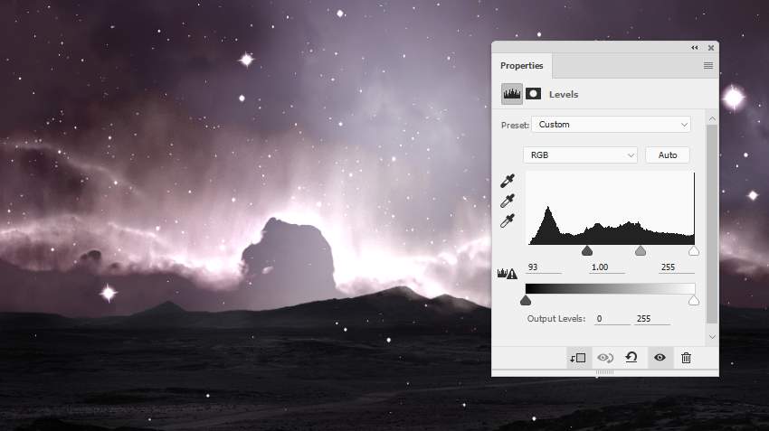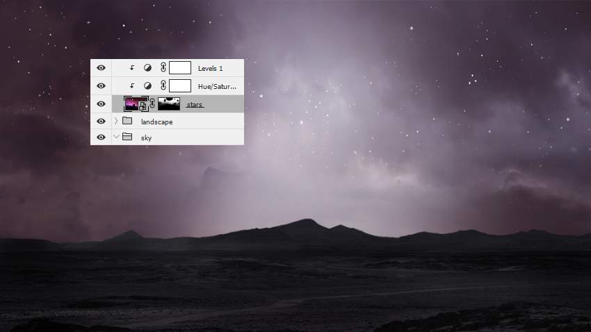 点击图层面板底部的第二个图标添加一个蒙版该层。使用一个黑色软刷清理地上的星星在天空和减少影响的可见性的区域。