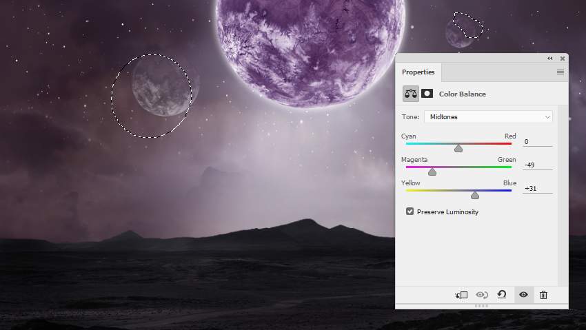 做一个色彩平衡调整图层改变行星的颜色。图层蒙版,用黑色软刷减少红色影响小的行星。