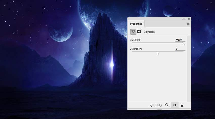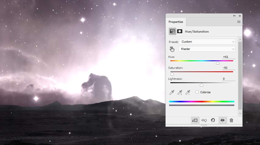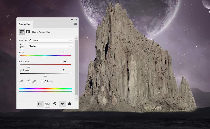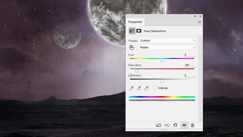 选择这些行星图层,点击Control-G让一群。设置这个集团的模式为正常的100%,使用色相/饱和度调整图层组内稀释的行星。