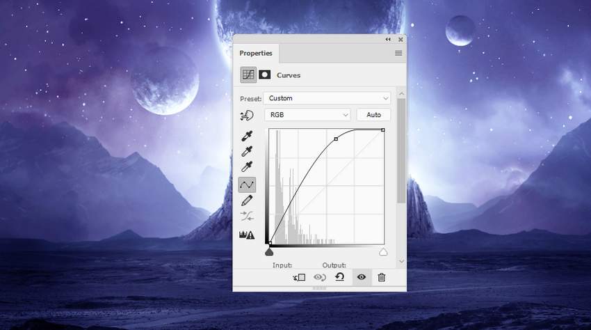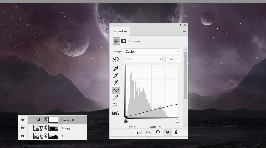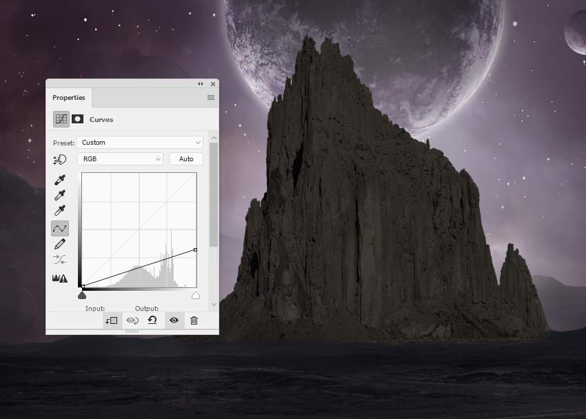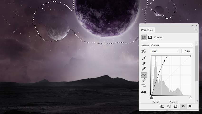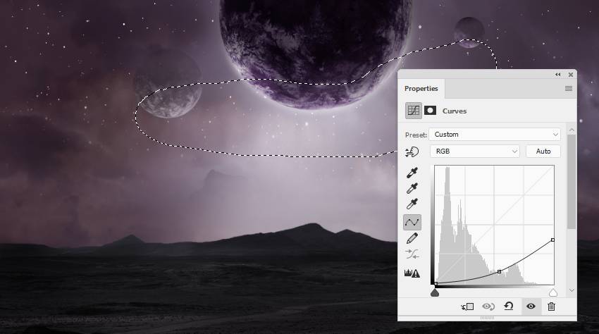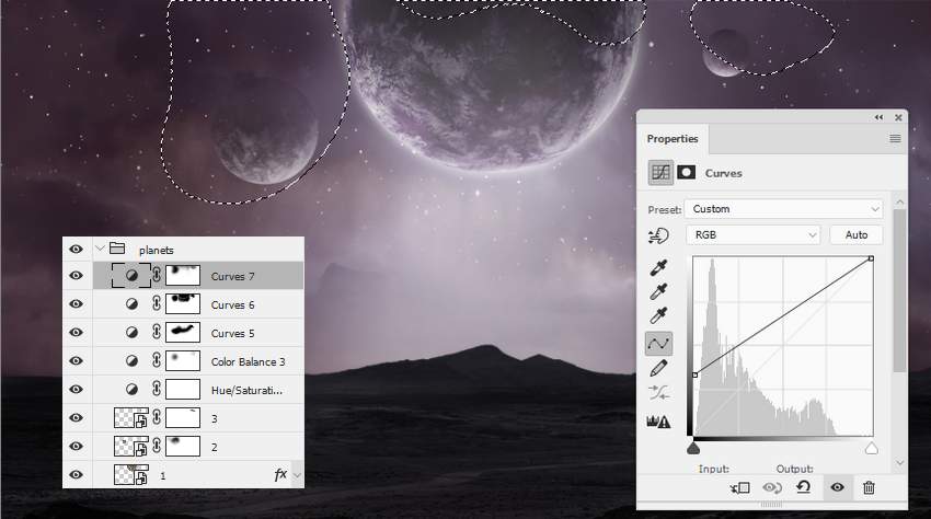 创建另一个曲线调整层,使行星,特别是大的、朦胧和混合更多的向天空。