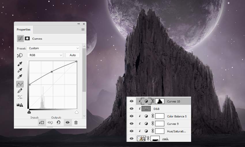 使用另一个曲线调整层岩石柔和的轮廓和朦胧起来。油漆在保持其对比度和阴影。