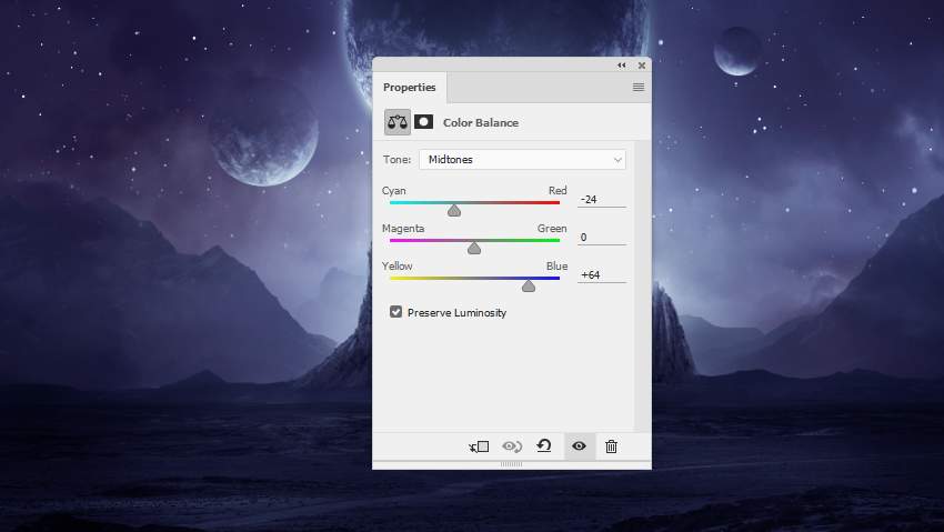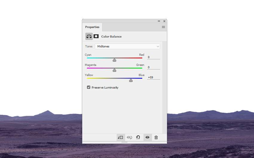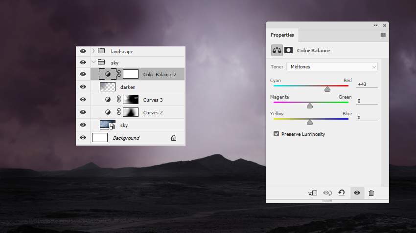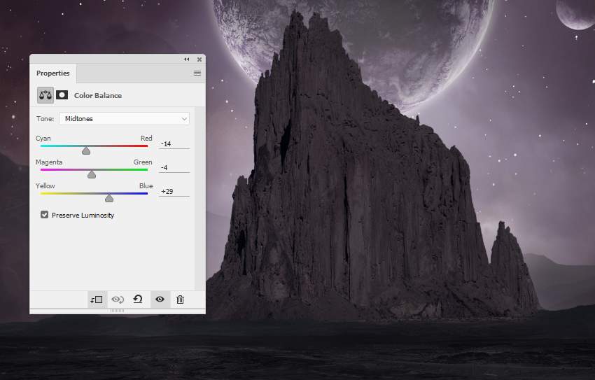 使用色彩平衡调整图层和改变中间调设置使天空更紫色:
