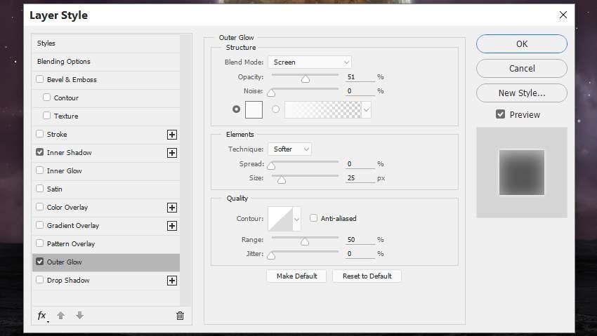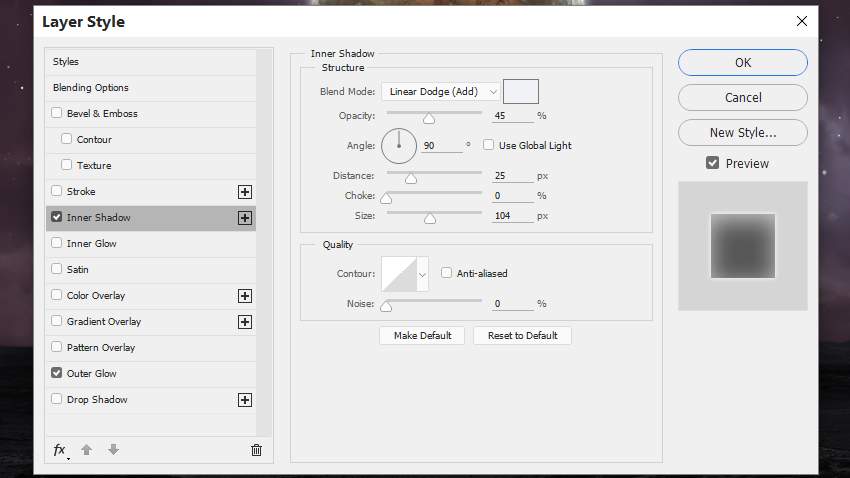 双击大行星图层,选择内阴影和外发光。设置阴影的颜色 #f4f5f6和发光颜色为白色。