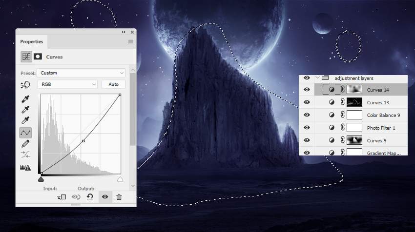 使用另一个曲线调整层带来更多光低的行星。油漆在更高领域的行星,所以他们不会受此影响调整图层。