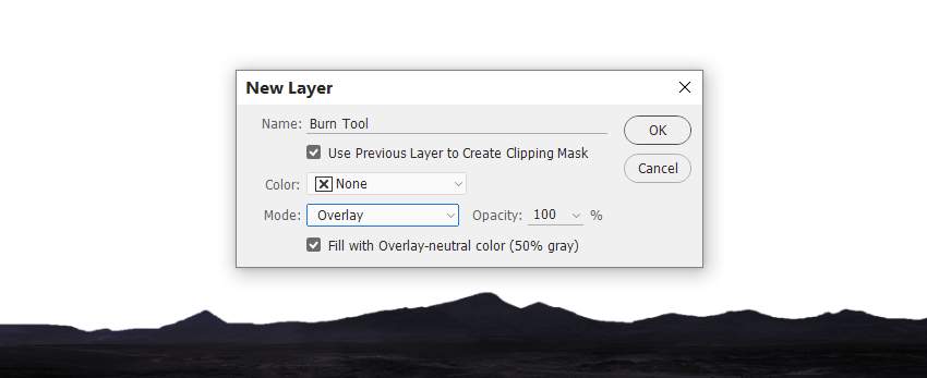 激活加深工具(O)和中间调范围,接触约25%变黑的左边缘景观。你可以看到我是如何做到与正常模式和结果叠加模式。