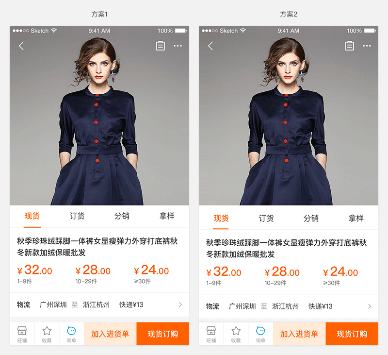 B类Offerdetail改版,B类商品详情页较C类更加复杂。在旧版中,顶部Tab栏可切换商品、详情、参谋,分销和拿样功能放在商品页的次屏。新版Offerdetail加入了订货功能,并把分销和拿样功能一起放到了首屏。这样在首屏,便把商品拆为现货、订货、分销、拿样四个Tab。