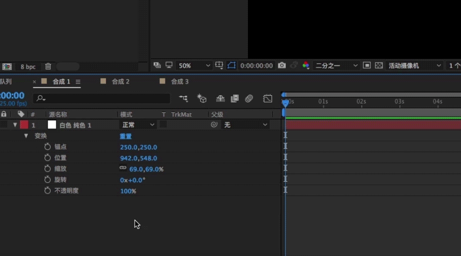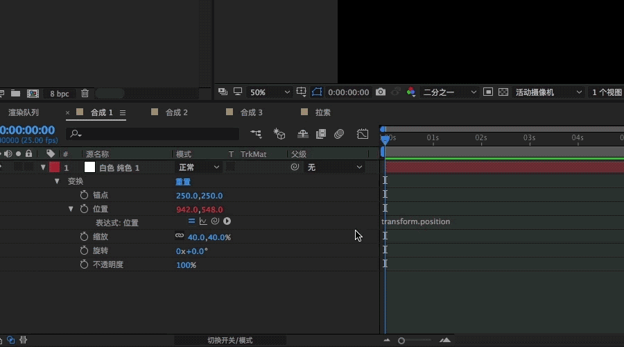 由上图可见单个数值和数组的区别,我们最常调节的就是单个数值。但是在AE里面的很多属性它其实是由多个数值组成的,我们把这种多个数值组成的数据类型叫做数组