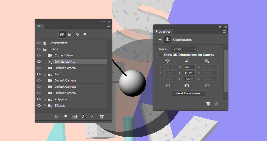 您还可以单击“ 属性”面板中的“ 坐标”选项卡以使用数值。请确定在决定所需的最终相机视图后进行更改。
