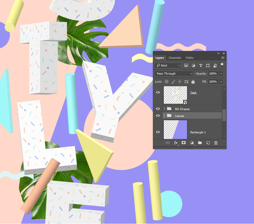 使用形状工具在文本后面添加几个不同的柔和色的形状,并将它们放在名为BG Shapes的组中。