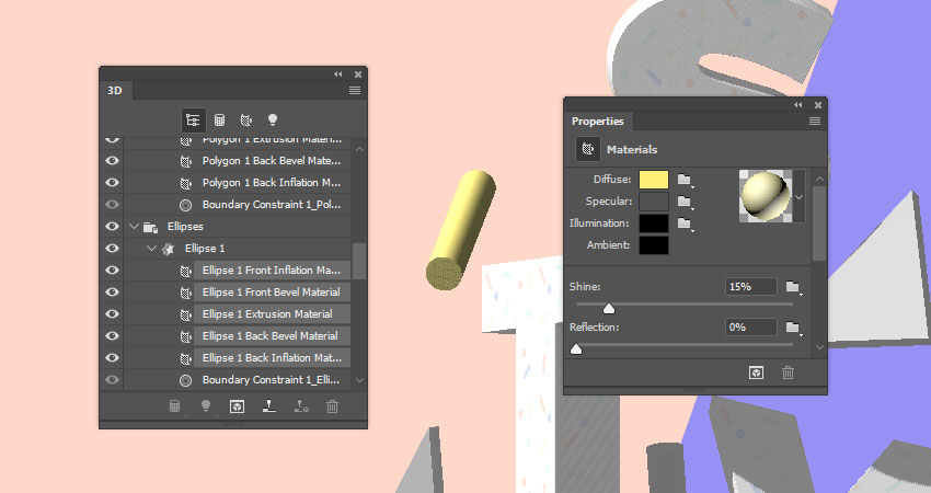 选择椭圆图层,选择所有材质选项卡,然后从材质选择器中选择形状材质以应用它。