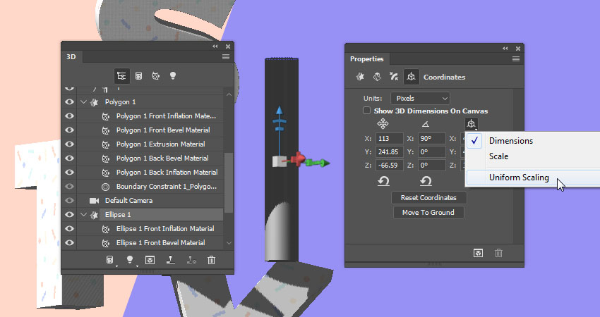 选择多边形图层,然后选择三维网格选项卡将其“ 挤出深度”更改为15。