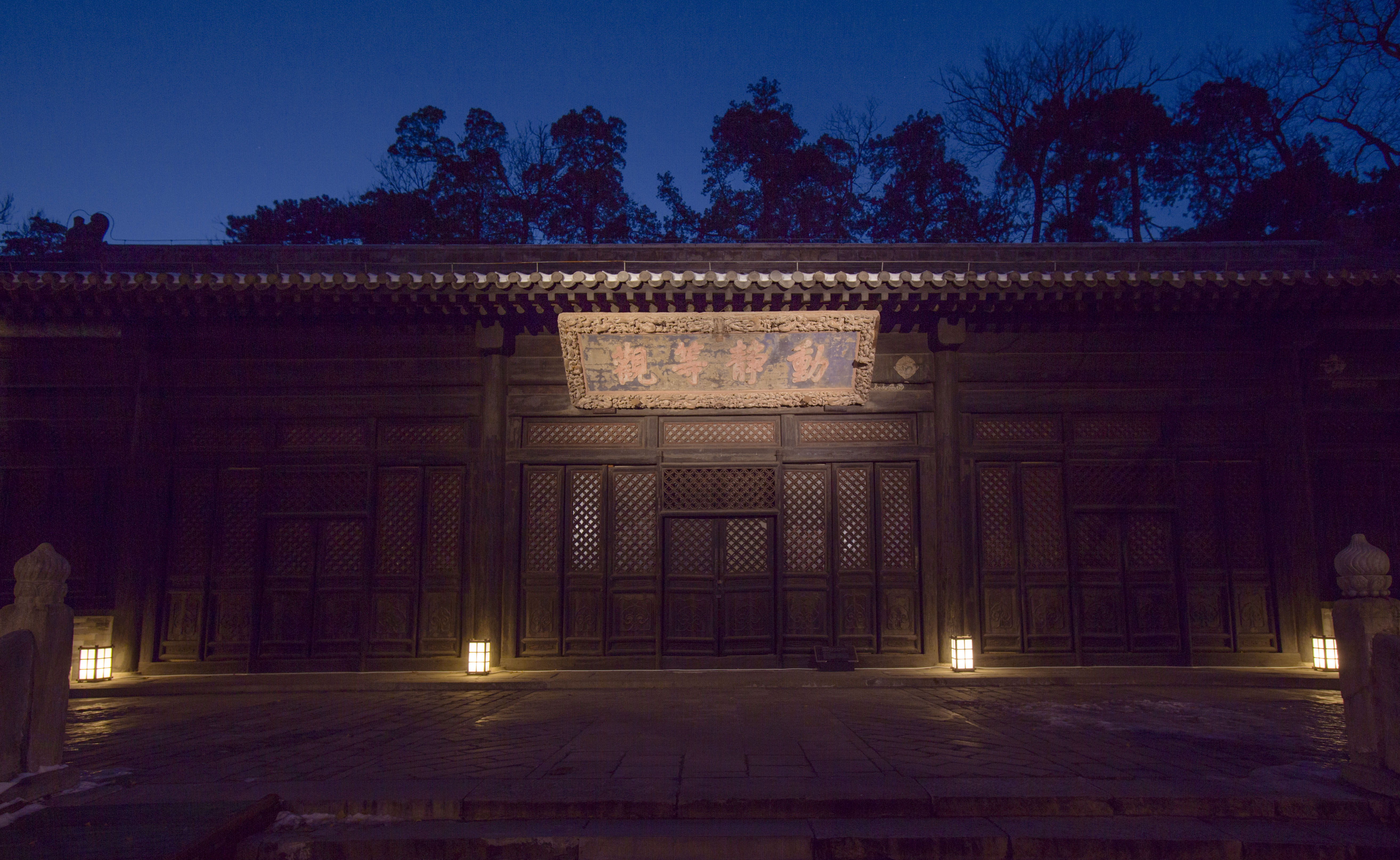 △ 大雄宝殿与无量寿佛殿为寺内仅存的古代大殿,大殿匾额书写的“无去来处”与“动静等观”均出自乾隆帝之手。大殿立面木质陈旧,色彩暗淡,这正是大殿的魅力。用漫射光与远投光这样朴素的照明形式去还原大殿古朴的特质。