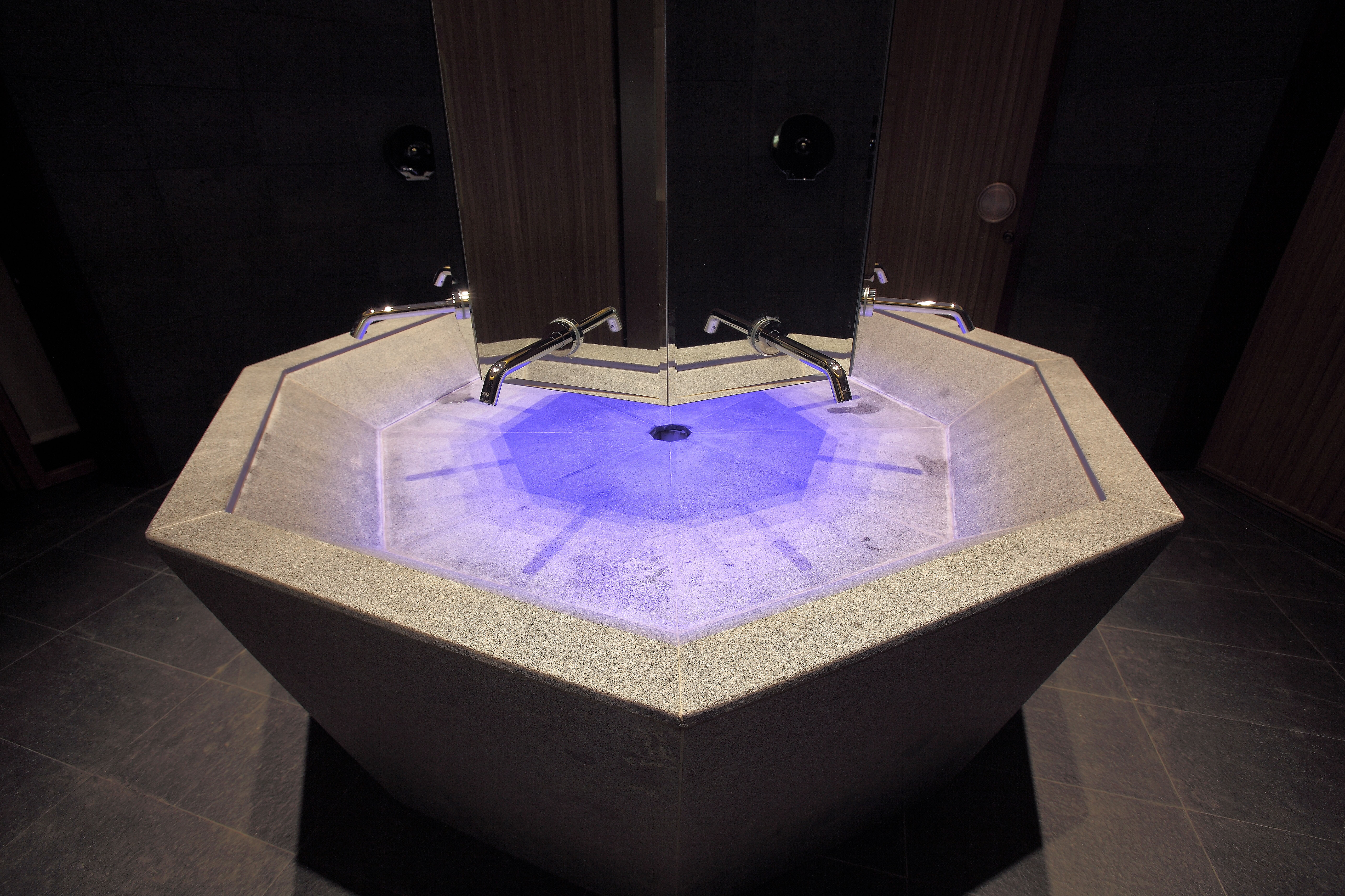 暖白光提供手盆的重点照明,兼顾镜前灯功能,出水区域采用低饱和度淡蓝色光,使得整个盥洗区空间有了层次和情绪的微妙对比。