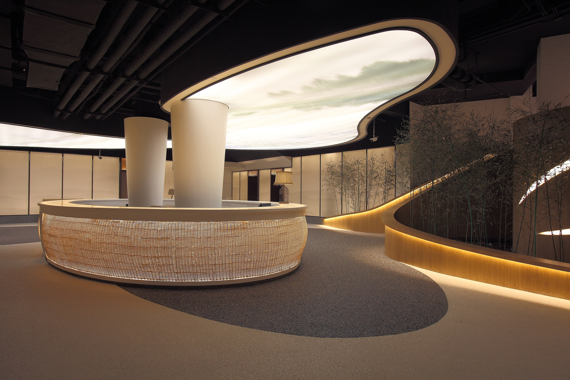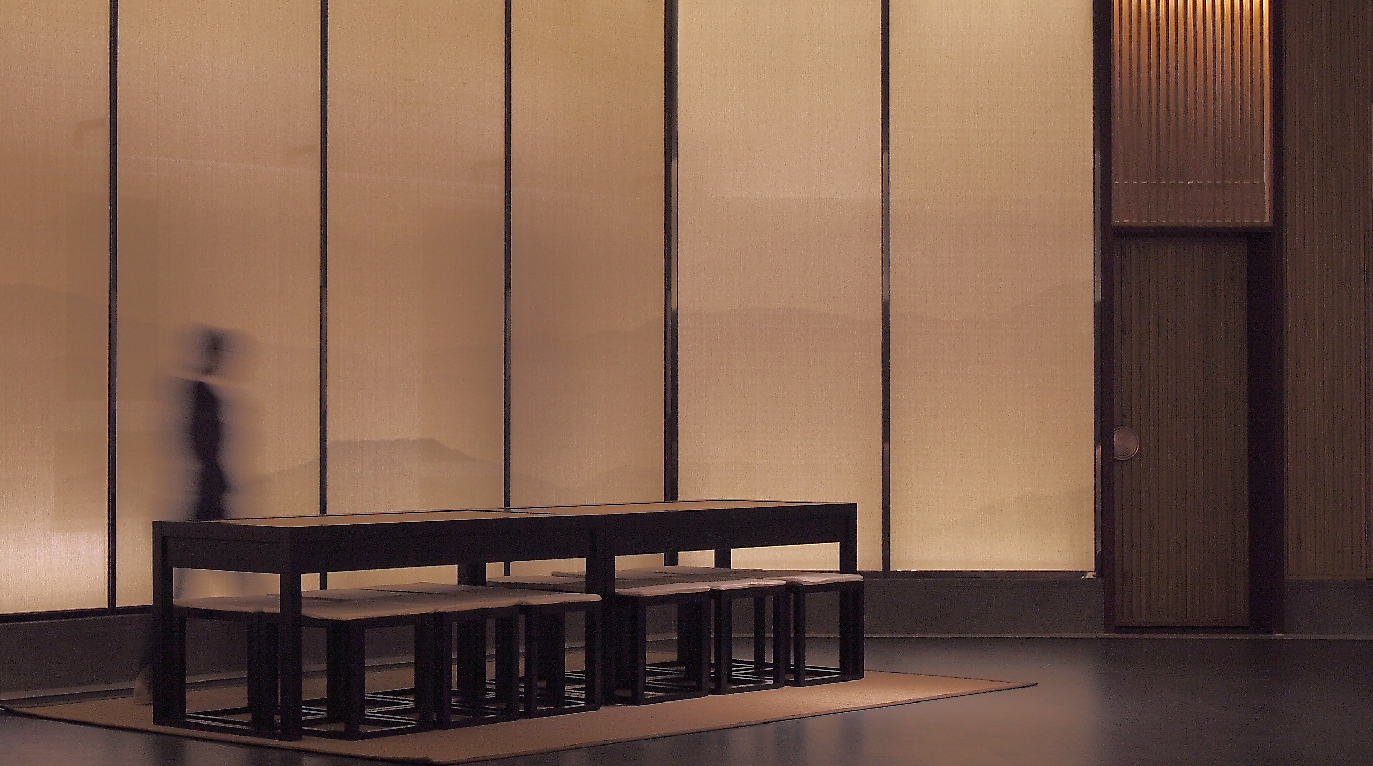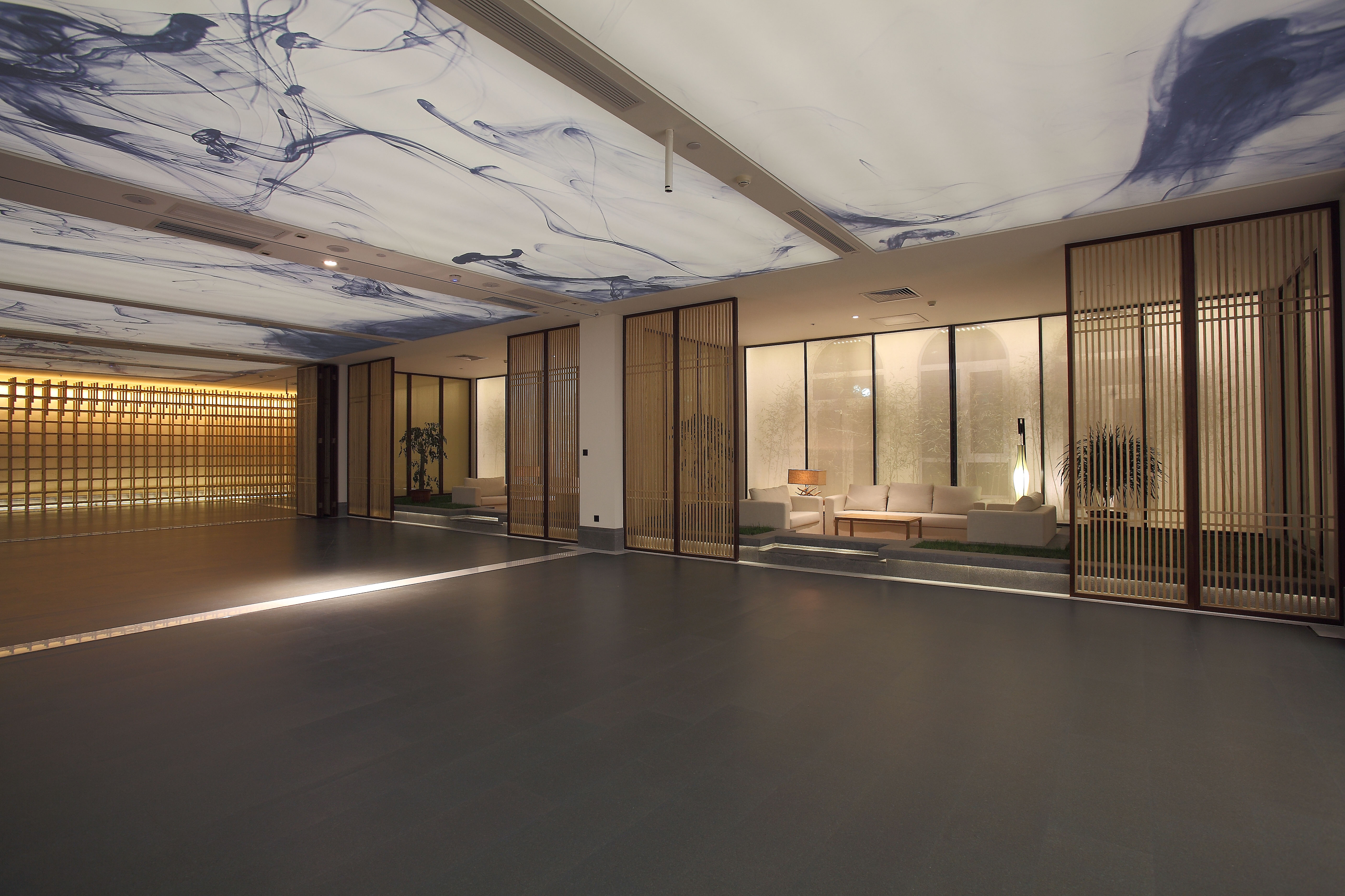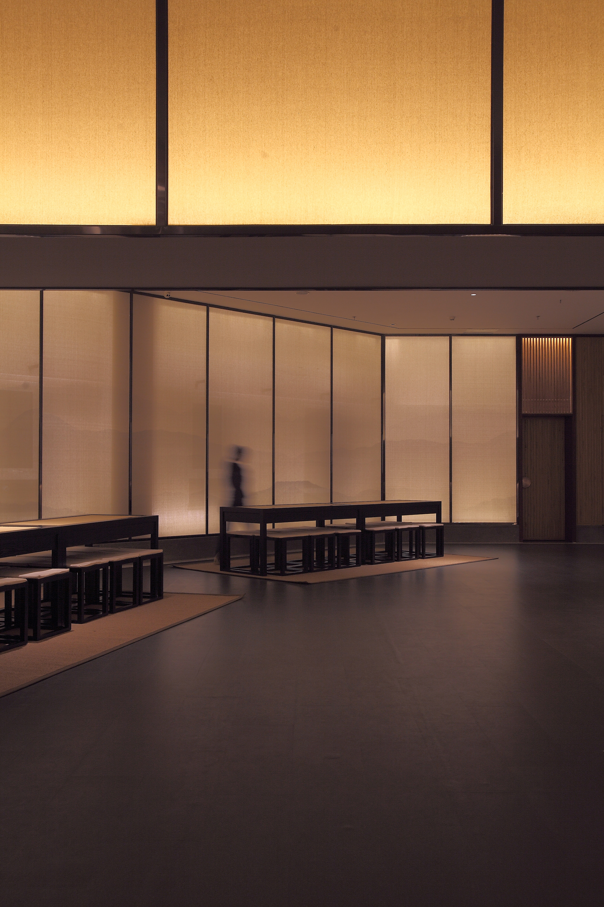 室内多处大面积的运用印有中国山水图案的纱帘作为立面材料,同时纱帘与背后的墙之间有一个狭长的空间,我们在这个空间内设置窄光束的线性投光灯照亮墙,通过反射的方式为室内提供柔和、连续的环境光。纱帘上的山水图案很淡,照的过亮图案就会消失,我们通过实验,在提供环境亮度与呈现山水图案之间找到了一个平衡点。
