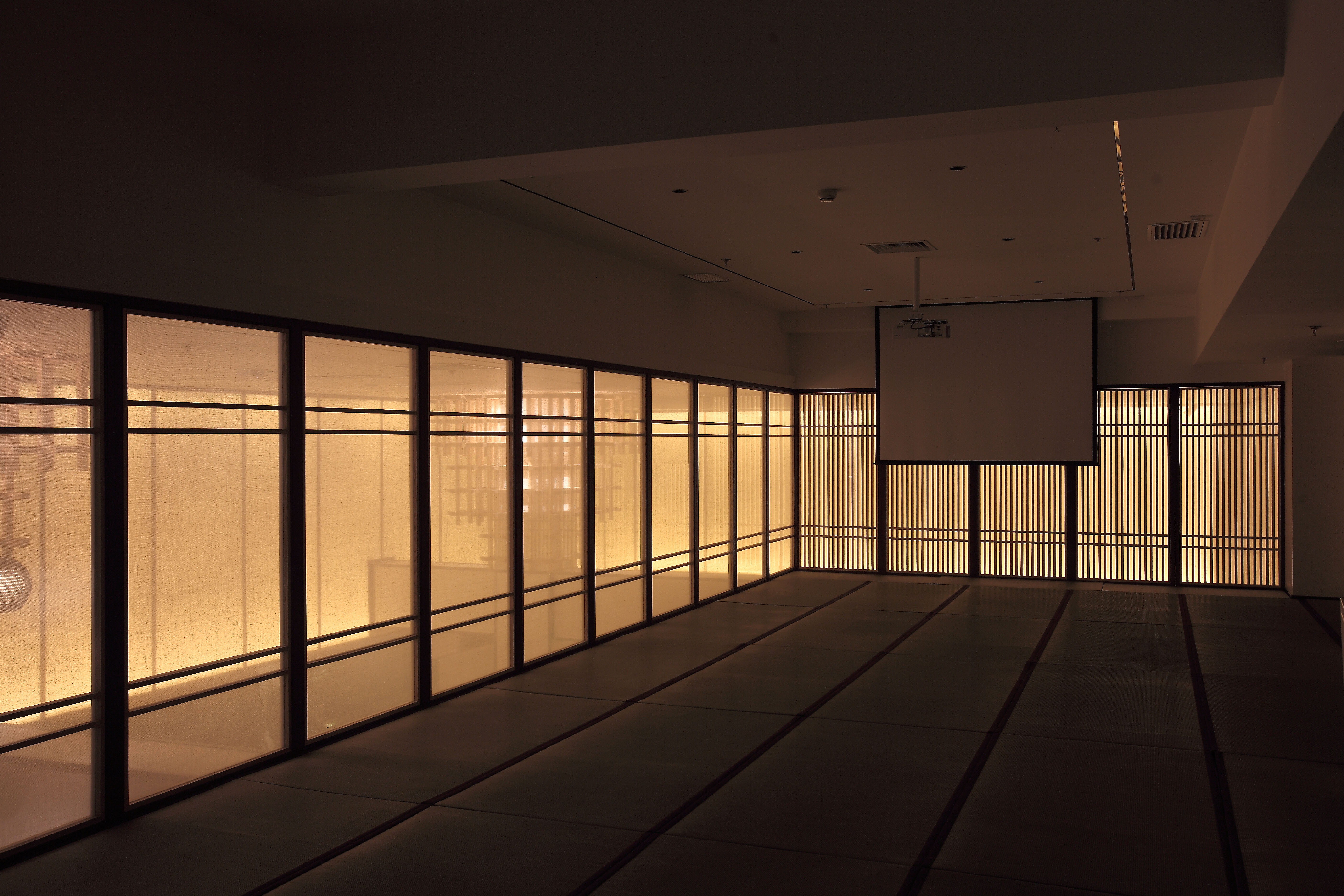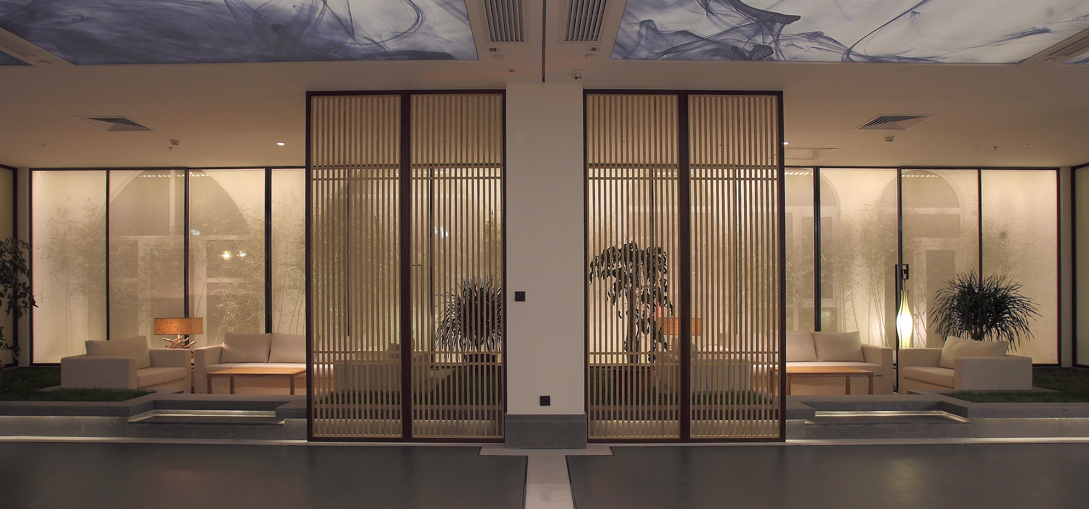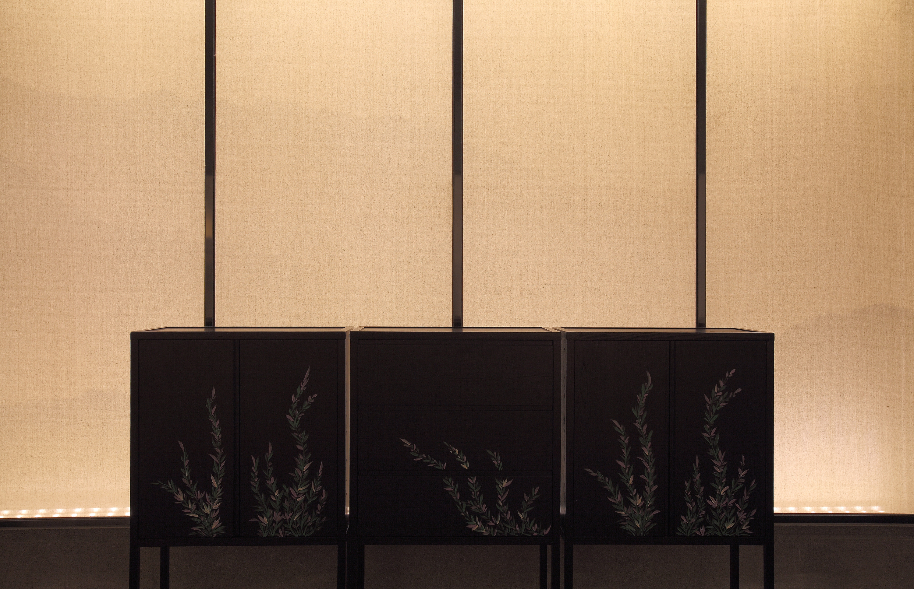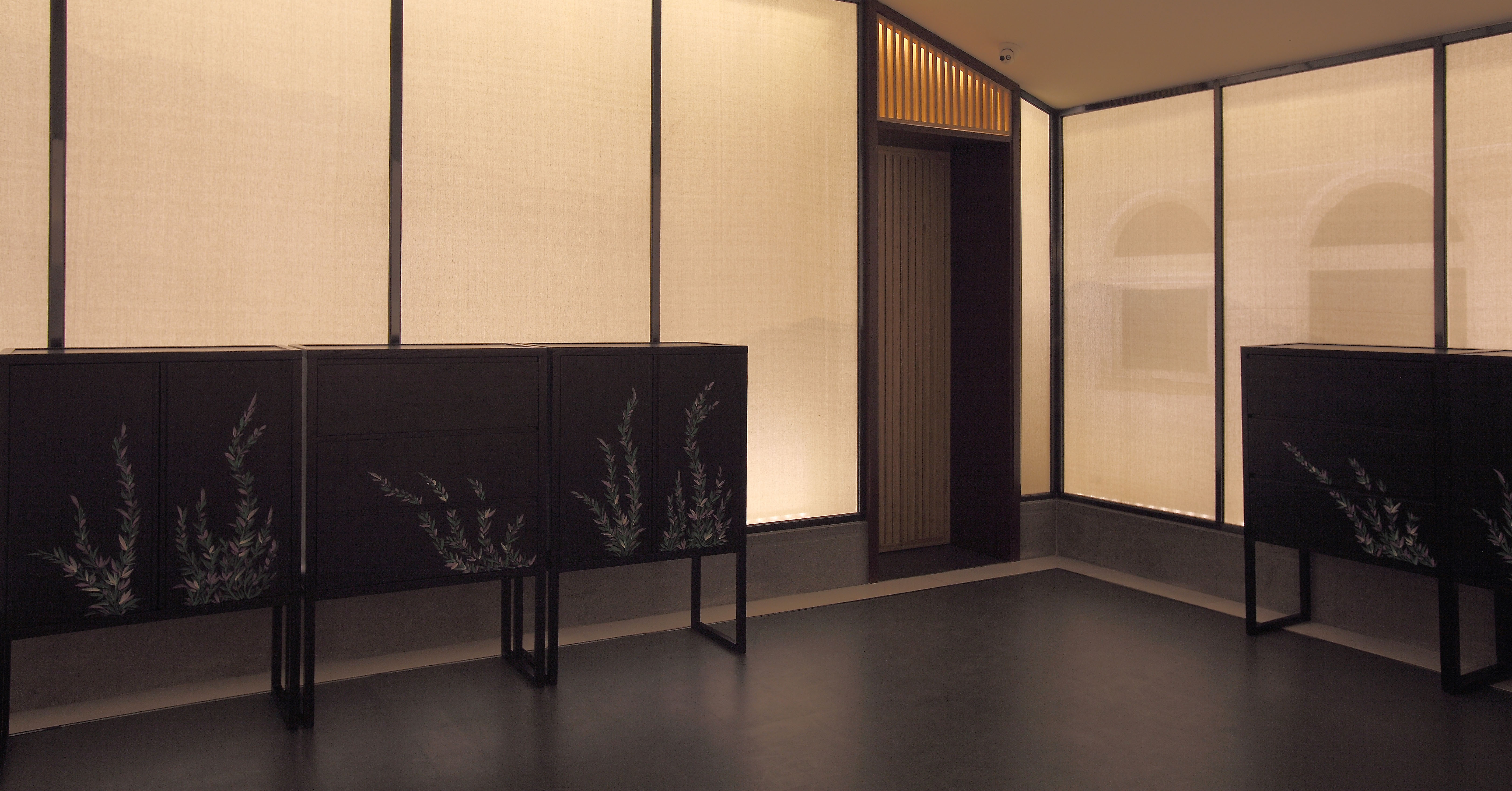 室内多处大面积的运用印有中国山水图案的纱帘作为立面材料,同时纱帘与背后的墙之间有一个狭长的空间,我们在这个空间内设置窄光束的线性投光灯照亮墙,通过反射的方式为室内提供柔和、连续的环境光。纱帘上的山水图案很淡,照的过亮图案就会消失,我们通过实验,在提供环境亮度与呈现山水图案之间找到了一个平衡点。