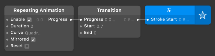 先调出repeating animation、transition,设置transition的start 0.7、end 0,然后将其连接并输出给左边线段的start端口,这时候就能看到线段来回伸缩了。