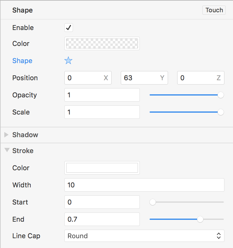 我们只需要描边的三角形,所以把shape中color的不透明度设置为0,stroke中的color设置为白色、width 8、start 0、end 0.7(具体数值根据三角形的大小而不同,只需要让三角形的底部消失不见就行)