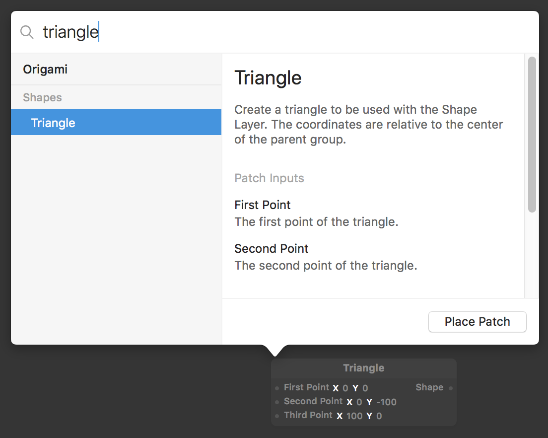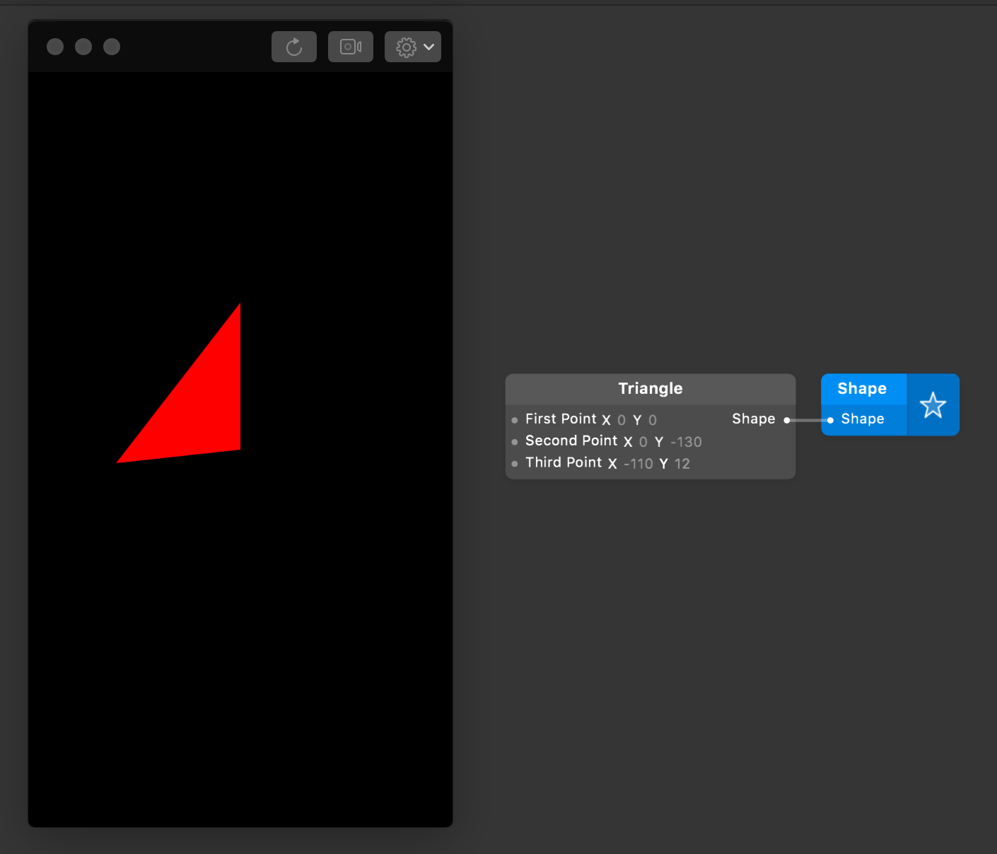 将triangle同shape的shape端口连接,这时候在预览窗口看到一个三角形,把triangle里的third point的x设置成负数就能让三角形反向了。