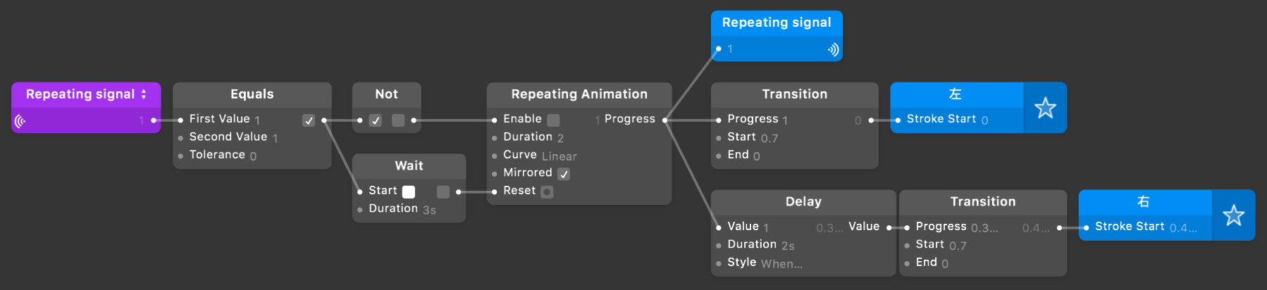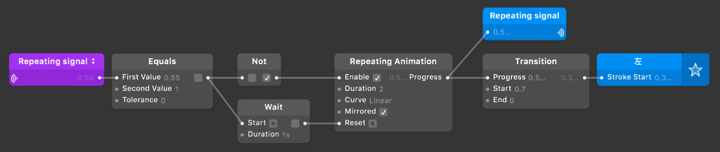 解释一下这里的逻辑,线段走完一个动画过程是从0~1,再回来是从1~0(仔细观察progress的值)。所以用equals判断信号=1时输出信号1断开not和enable的连接;同时信号=1时延时1s重制循环。循环重制的时候能自动打开enable,所以动画会重新开始。这样就做到了单向的循环动画。