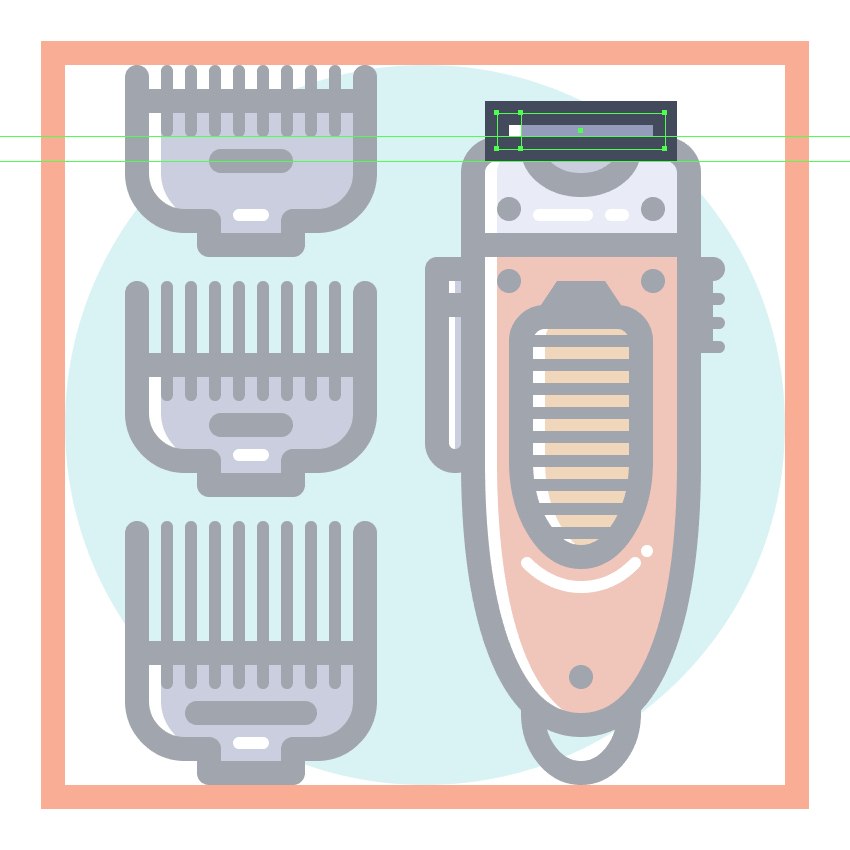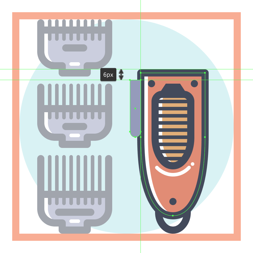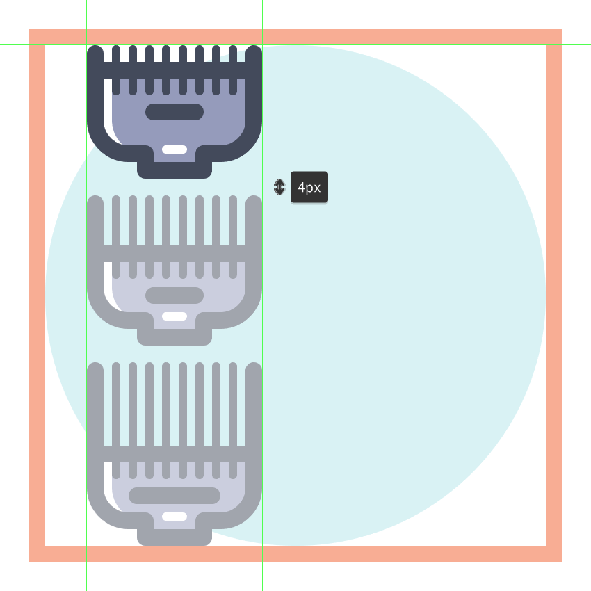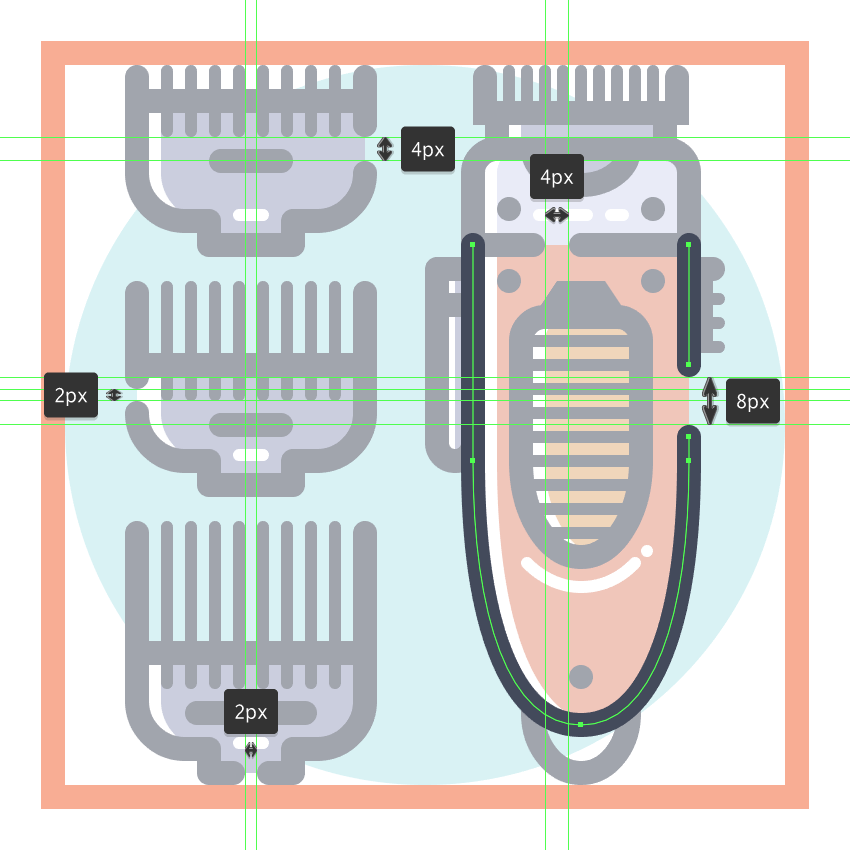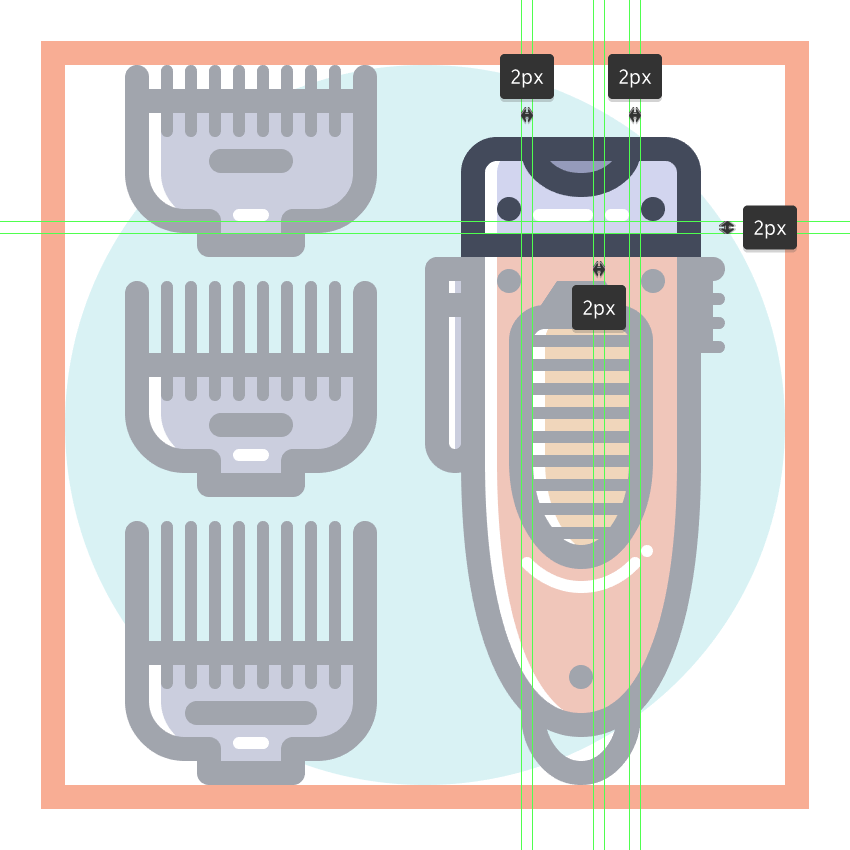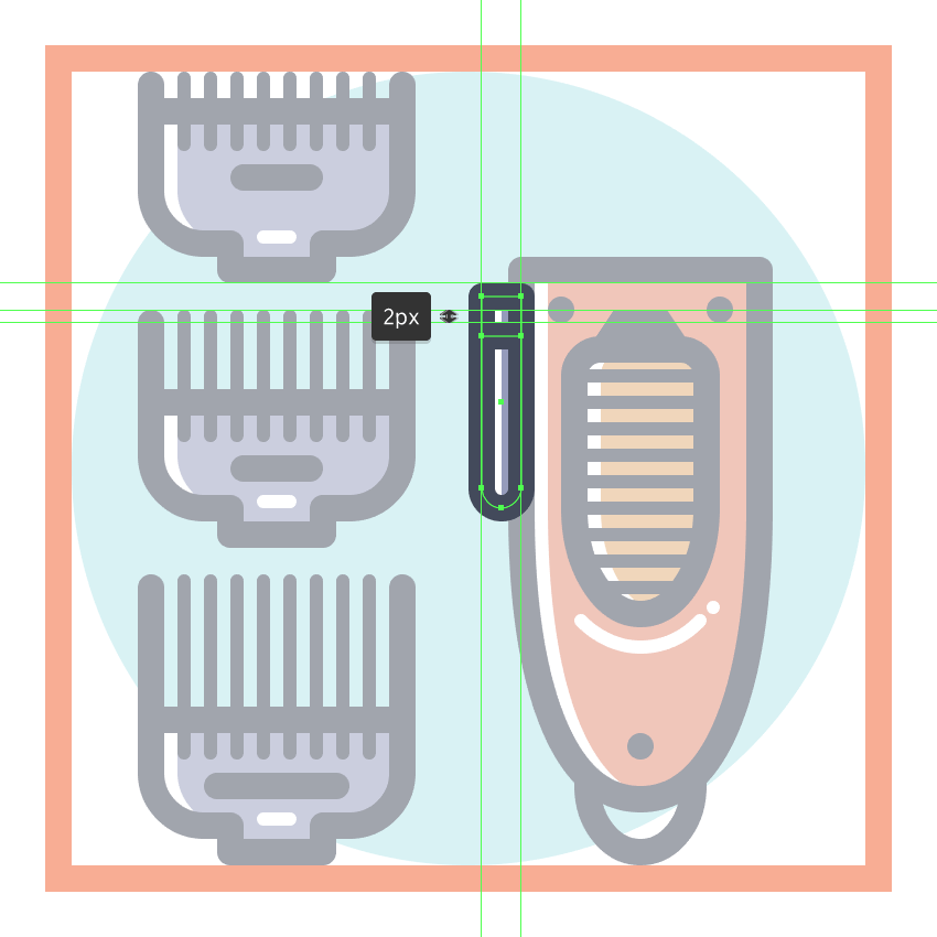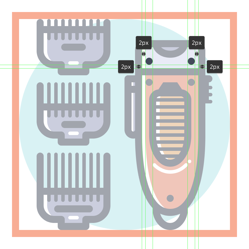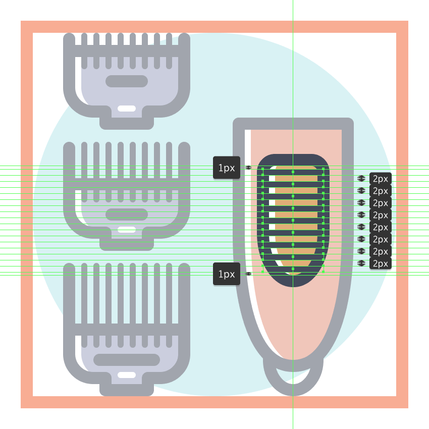 使用9个2 x 8 px圆角矩形(#41485B)添加1 px圆角半径的小齿,我们将水平堆叠1 px,分组(Control-G),然后将它们放置 在两个桥接段之间。慢慢来,一旦完成后,选择并分组(Control-G)当前部分的所有组成形状,然后对整个理发推子进行相同的操作。