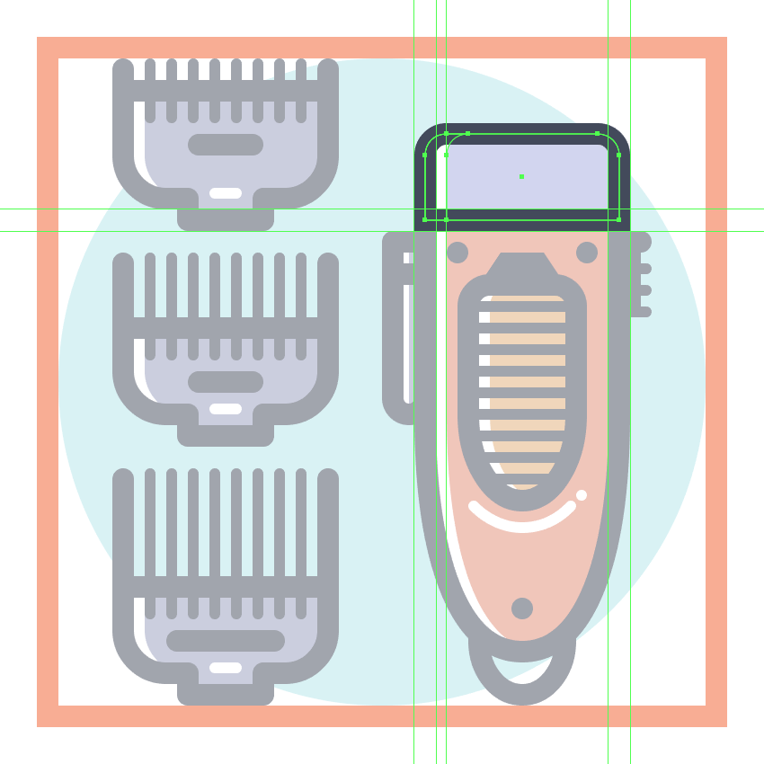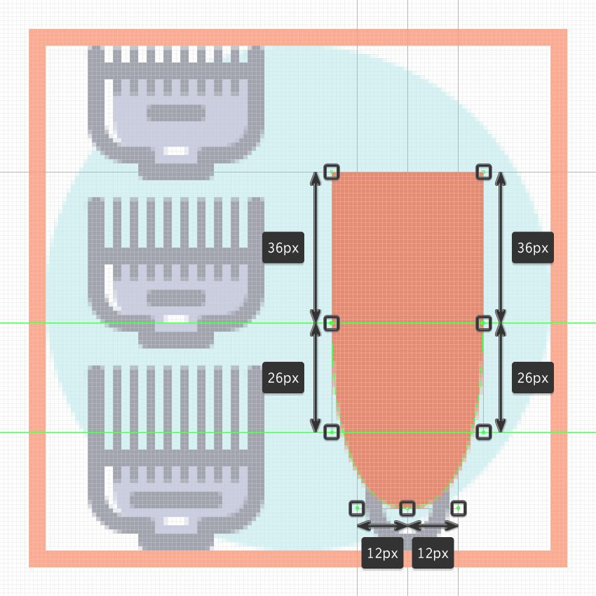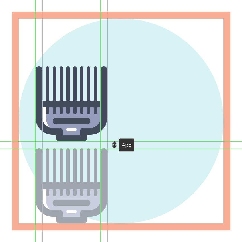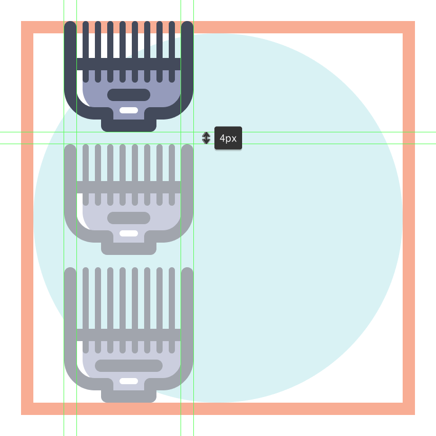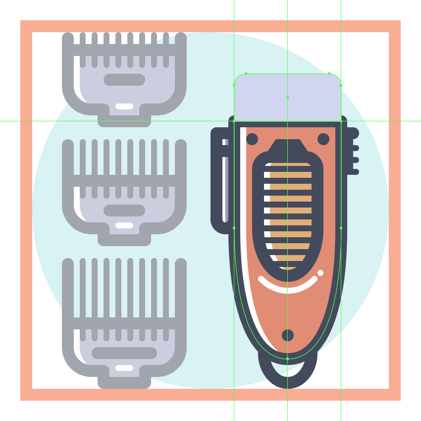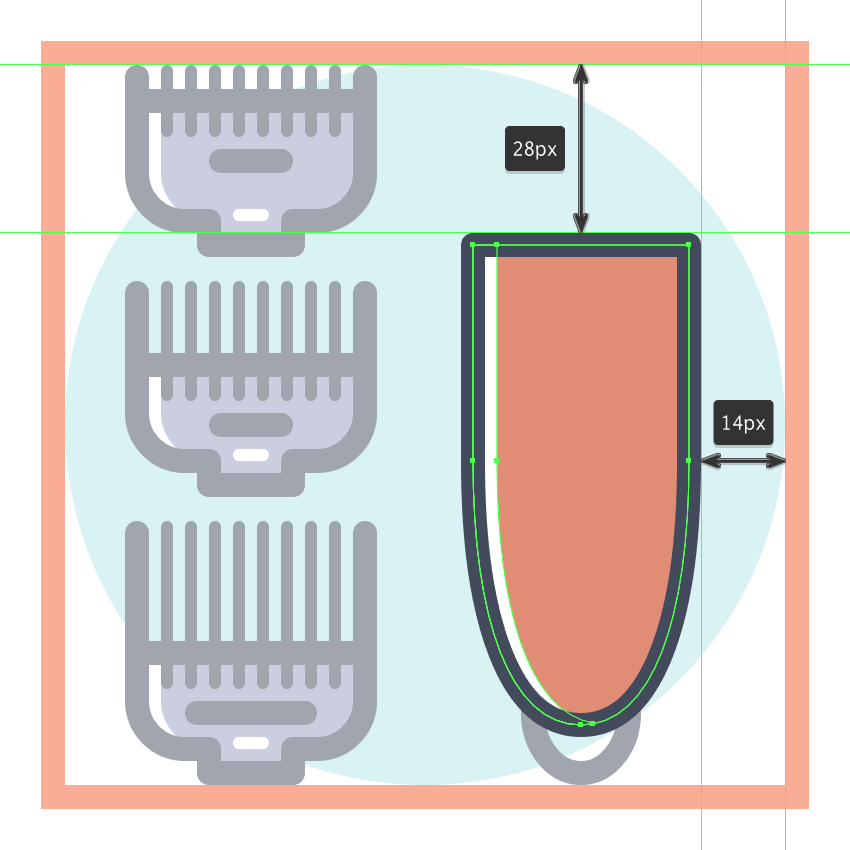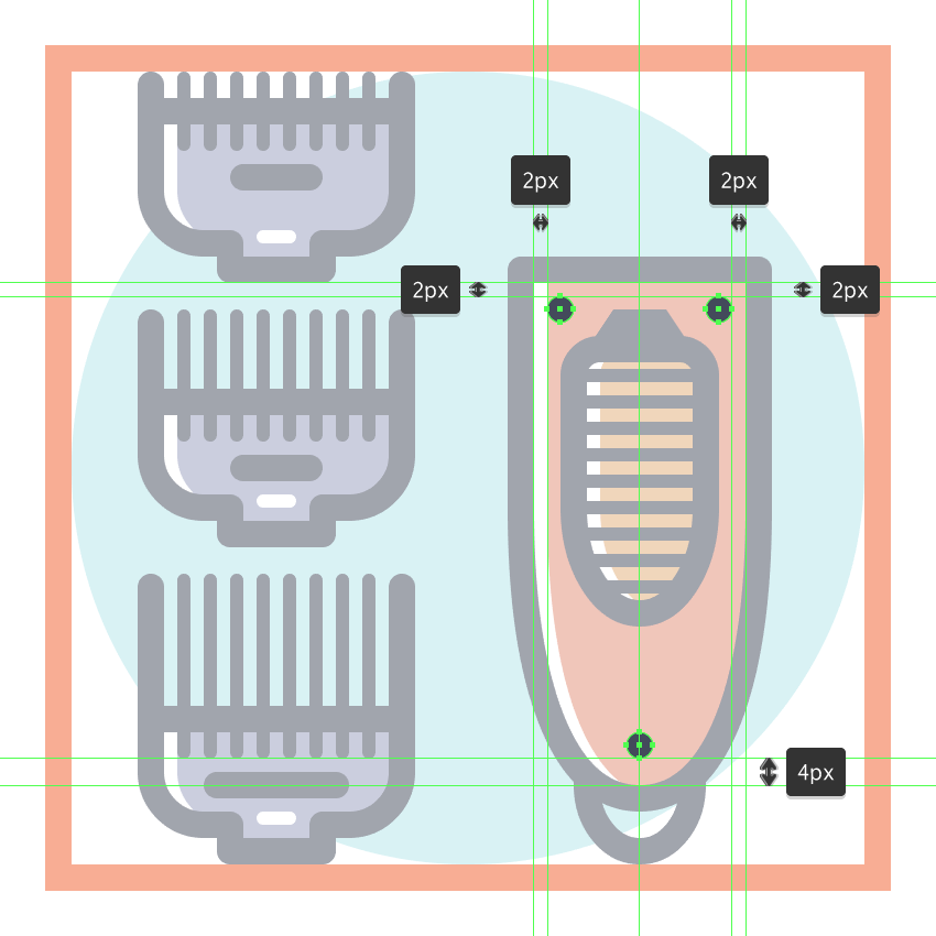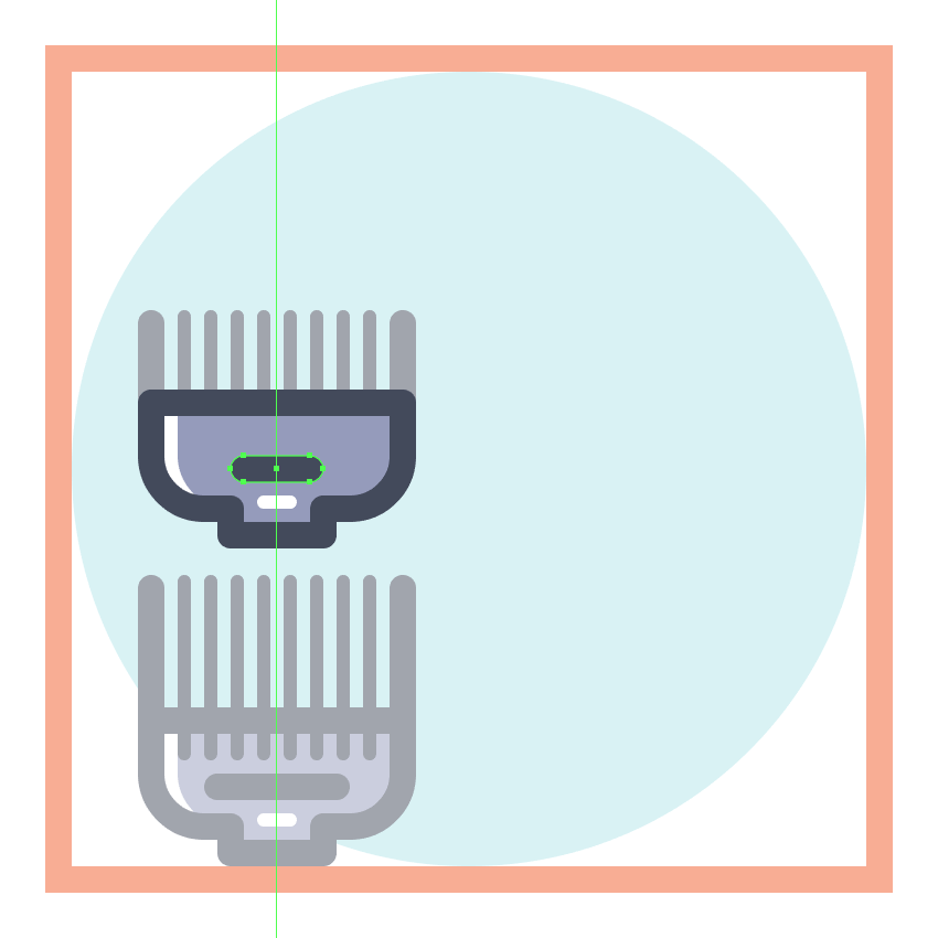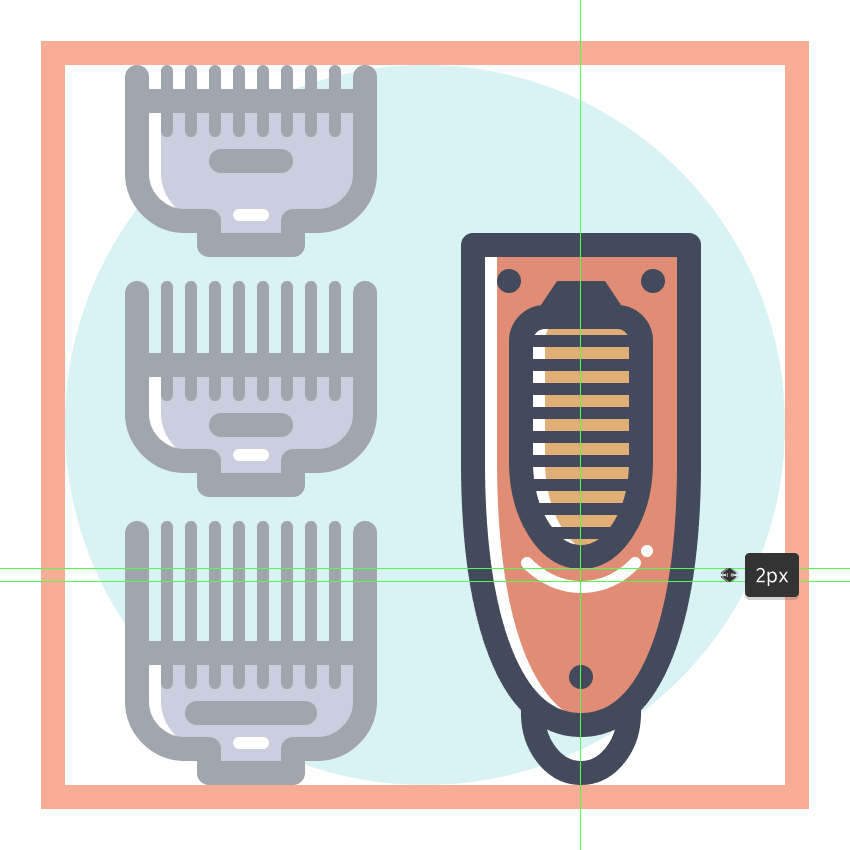 使用9个2 x 8 px圆角矩形(#41485B)添加1 px圆角半径的小齿,我们将水平堆叠1 px,分组(Control-G),然后将它们放置 在两个桥接段之间。慢慢来,一旦完成后,选择并分组(Control-G)当前部分的所有组成形状,然后对整个理发推子进行相同的操作。