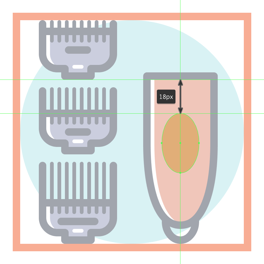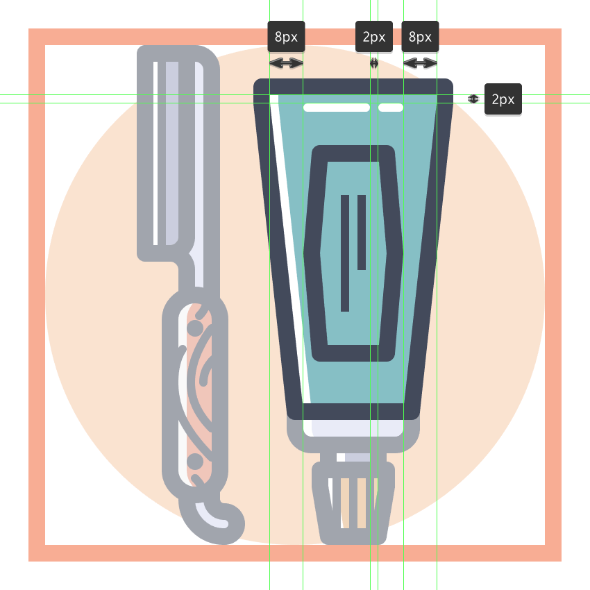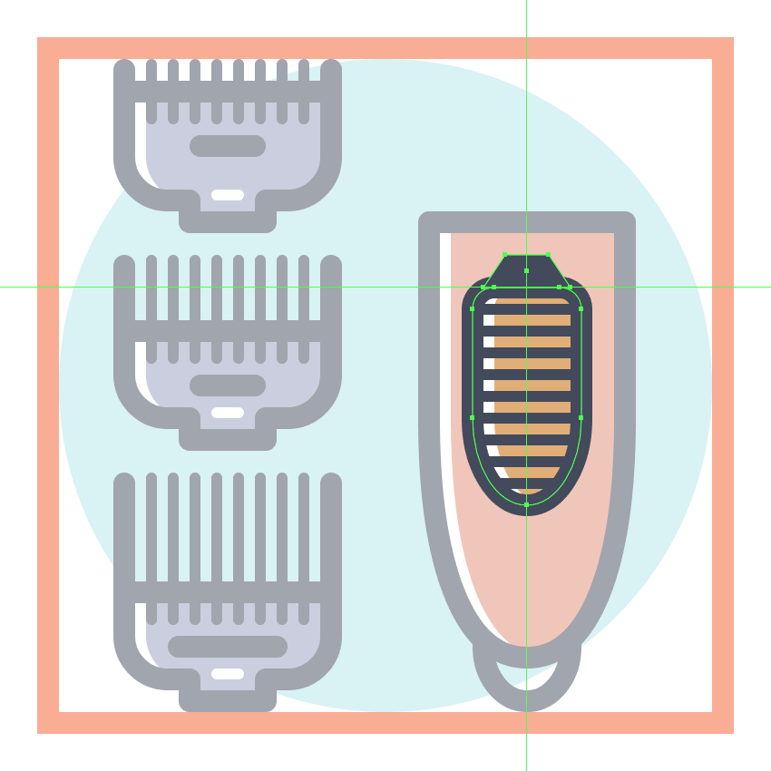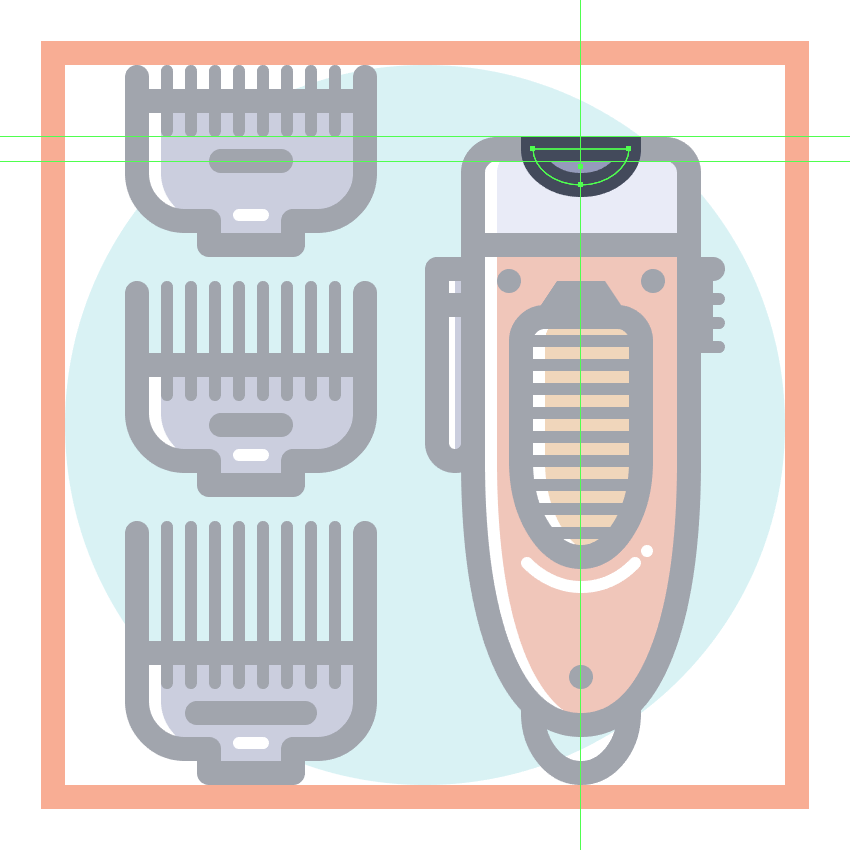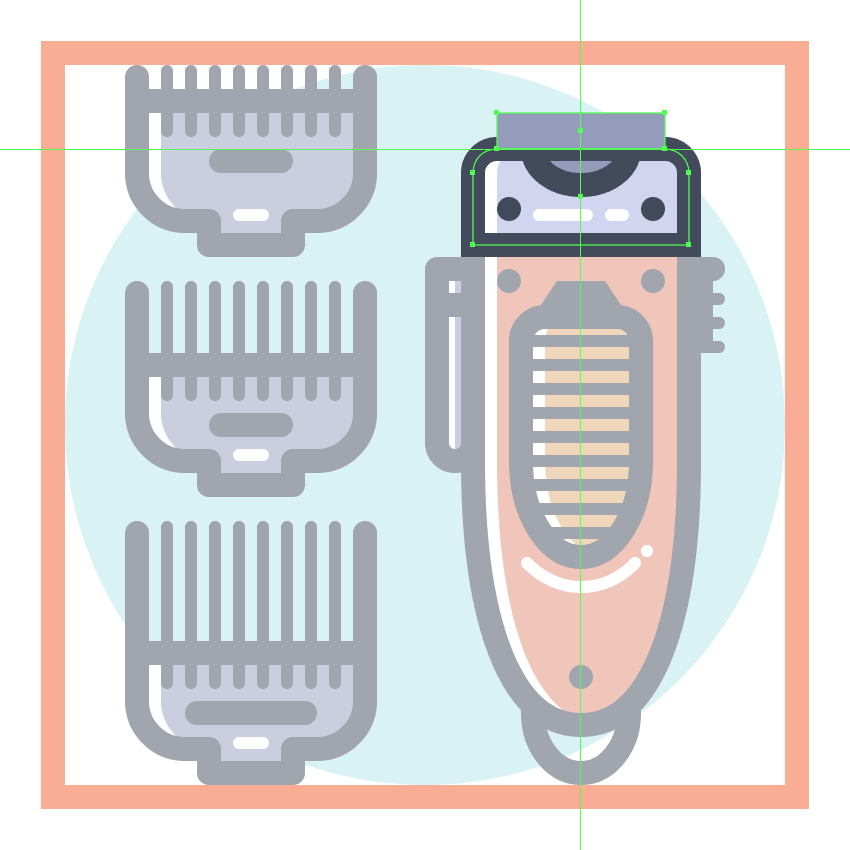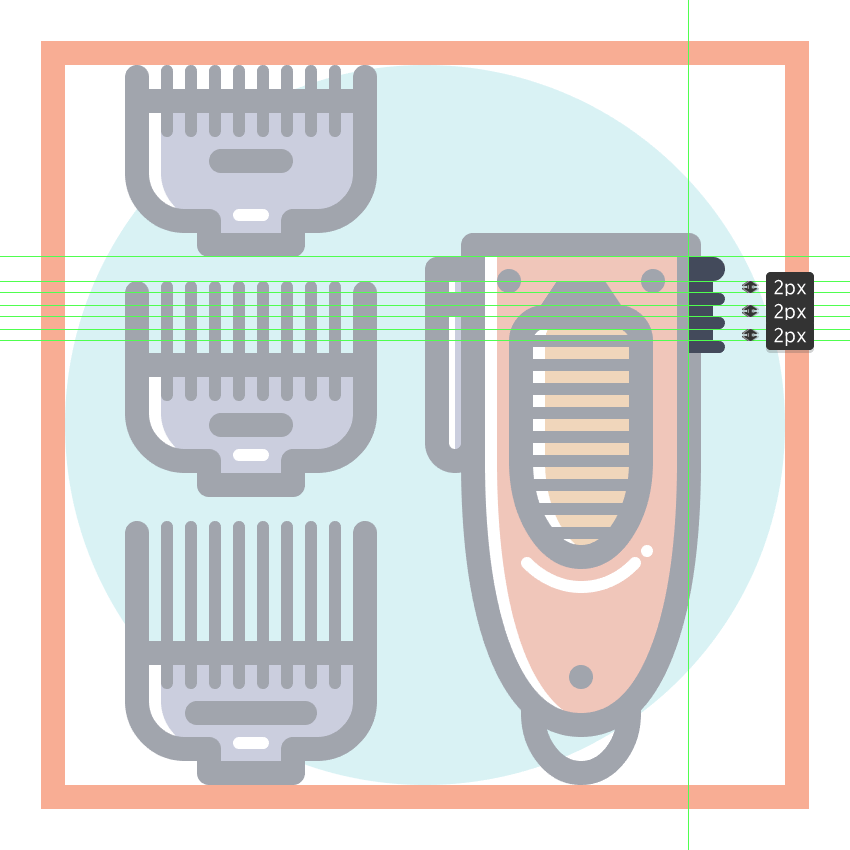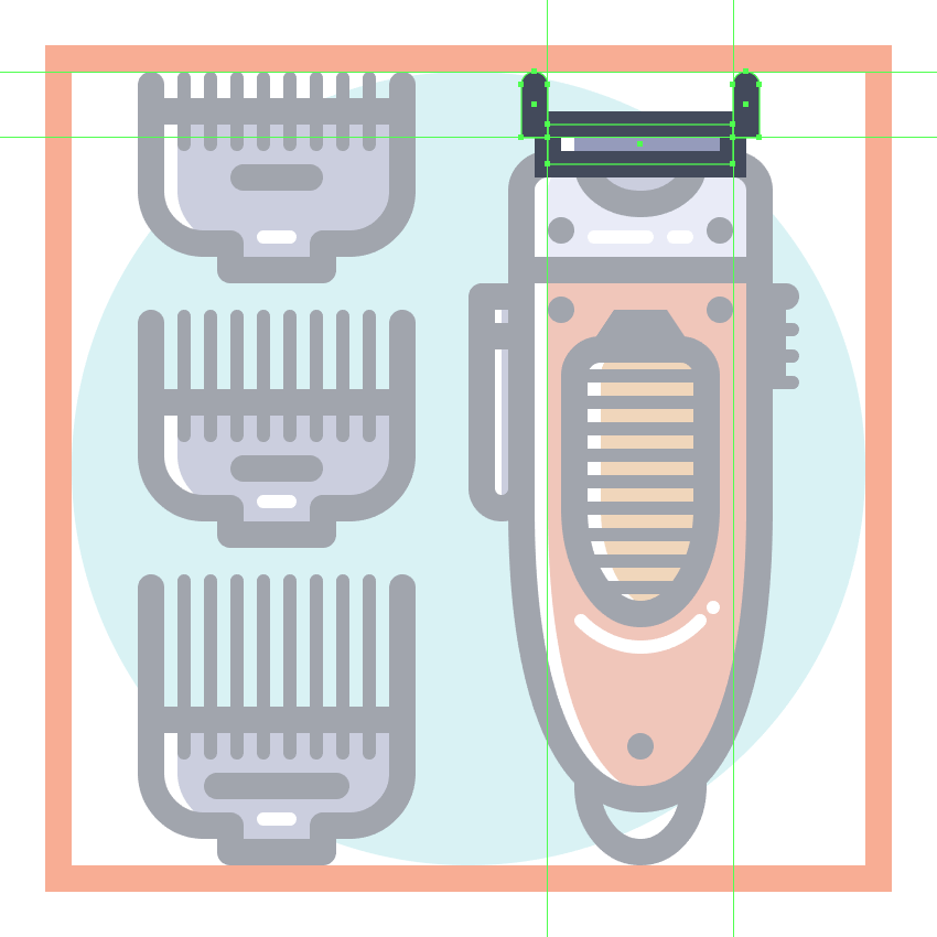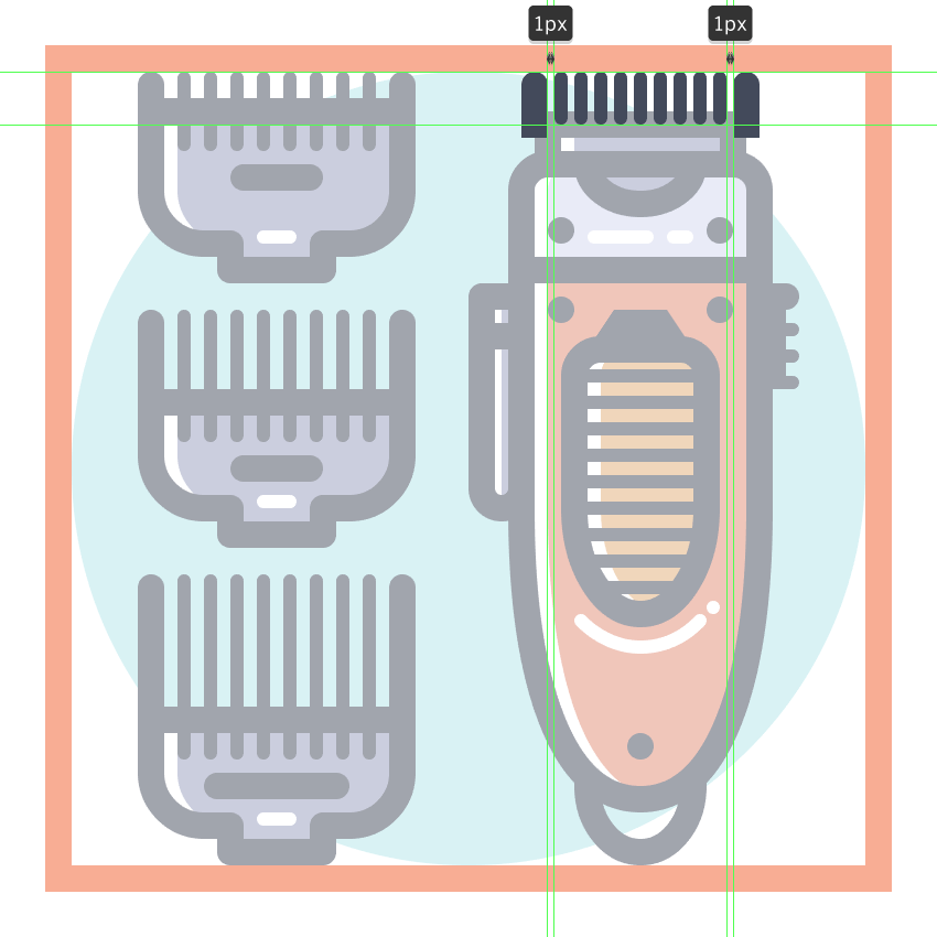 使用9个2 x 8 px圆角矩形(#41485B)添加1 px圆角半径的小齿,我们将水平堆叠1 px,分组(Control-G),然后将它们放置 在两个桥接段之间。慢慢来,一旦完成后,选择并分组(Control-G)当前部分的所有组成形状,然后对整个理发推子进行相同的操作。