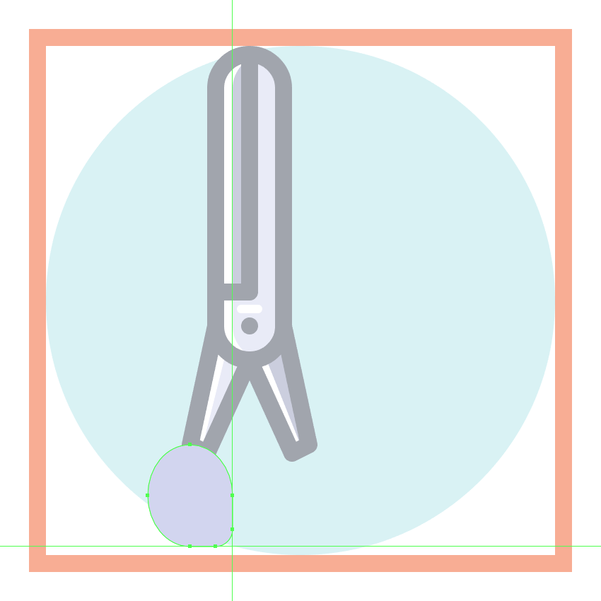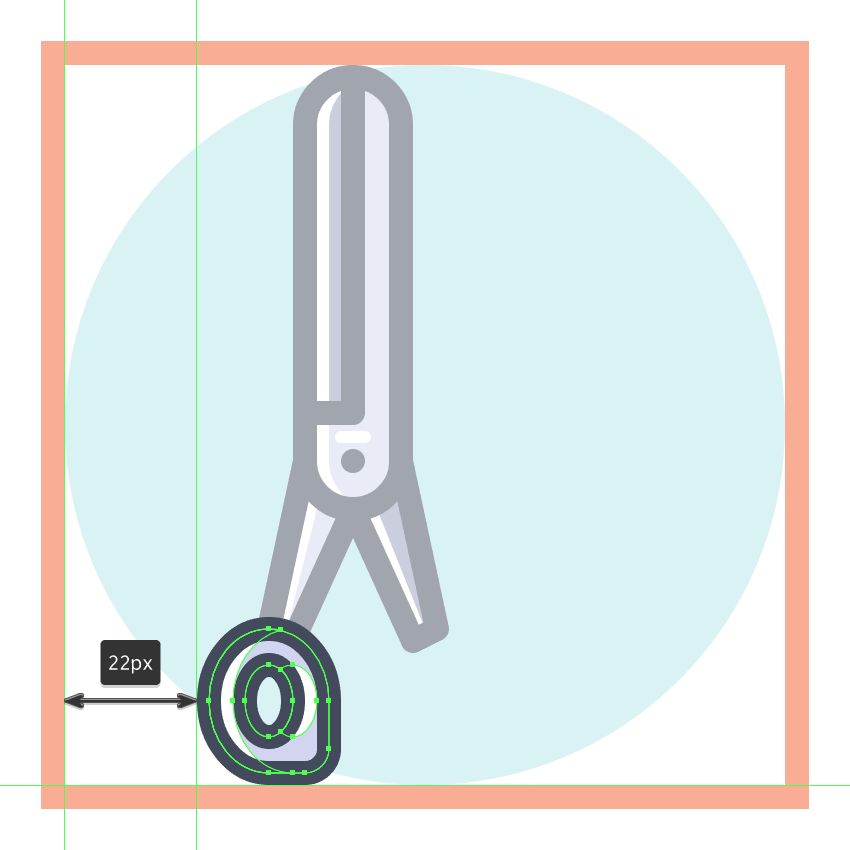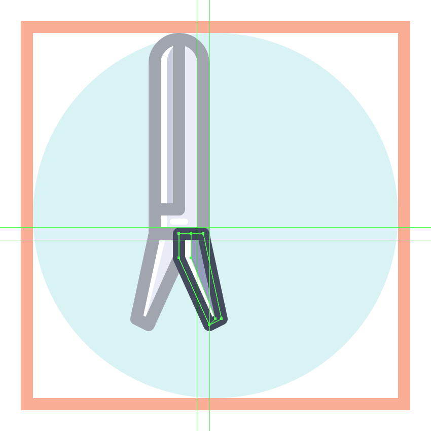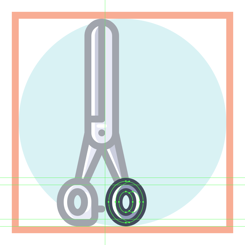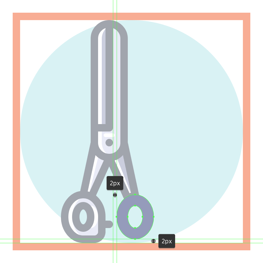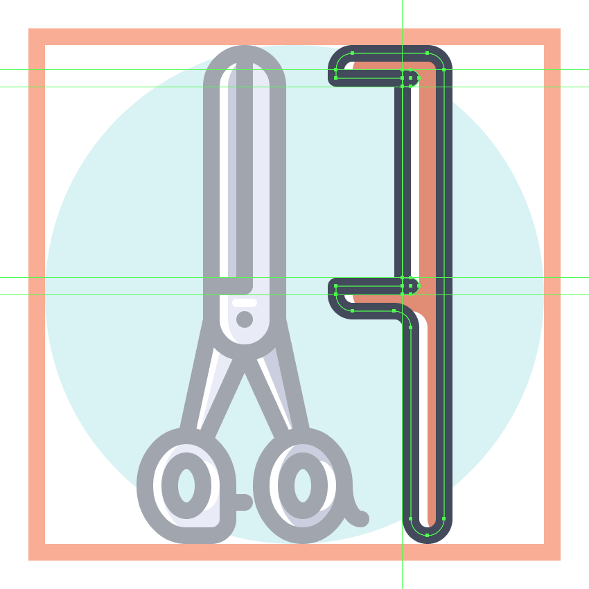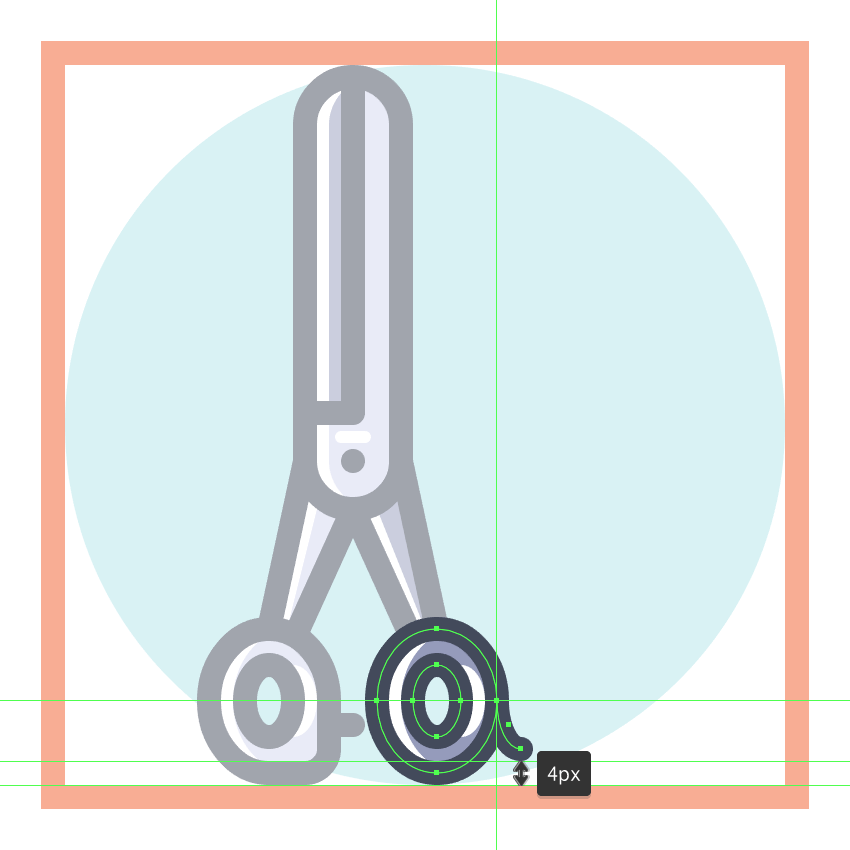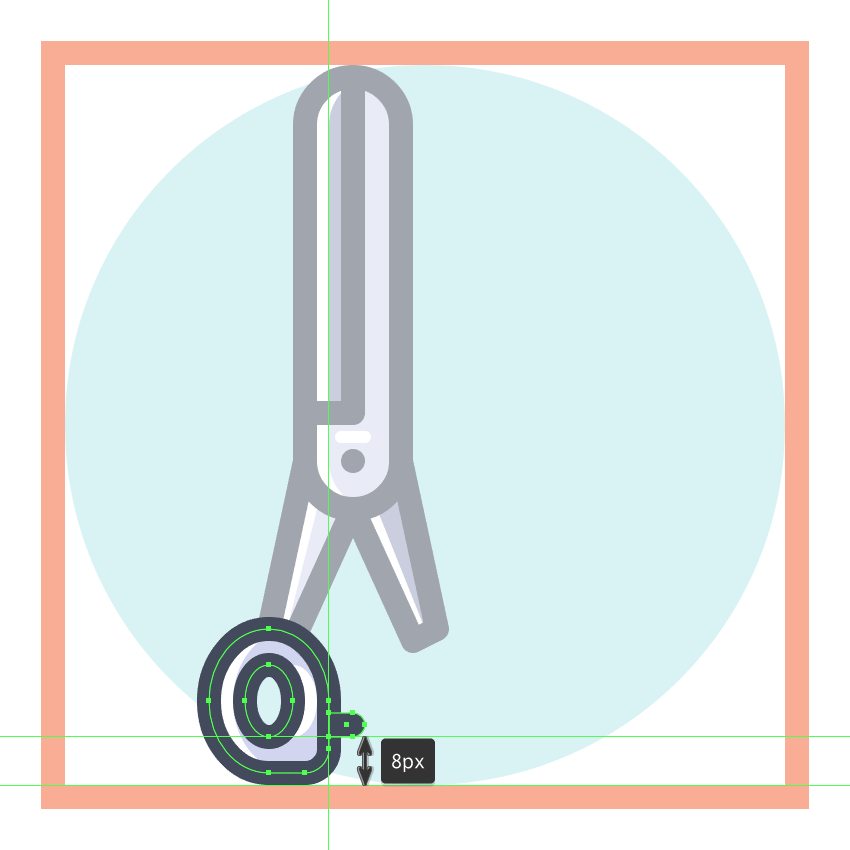 使用8 x 16像素椭圆和4像素厚的Stroke(#41485B)创建手指休息片段,我们将通过首先使用直接选择工具(A)选择其顶部和右侧锚点,然后通过按删除将其删除,从而进行调整。将产生的形状定位在手柄轮廓的右侧,确保将Cap设置为Round。由于我们已经完成了剪刀的工作,因此选择并将(Control-G)所有当前部分的组合形状组合在一起,然后对整个工具执行相同的操作。