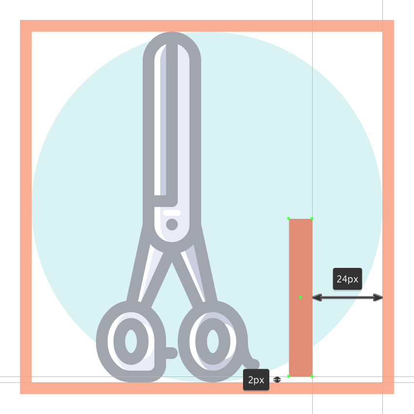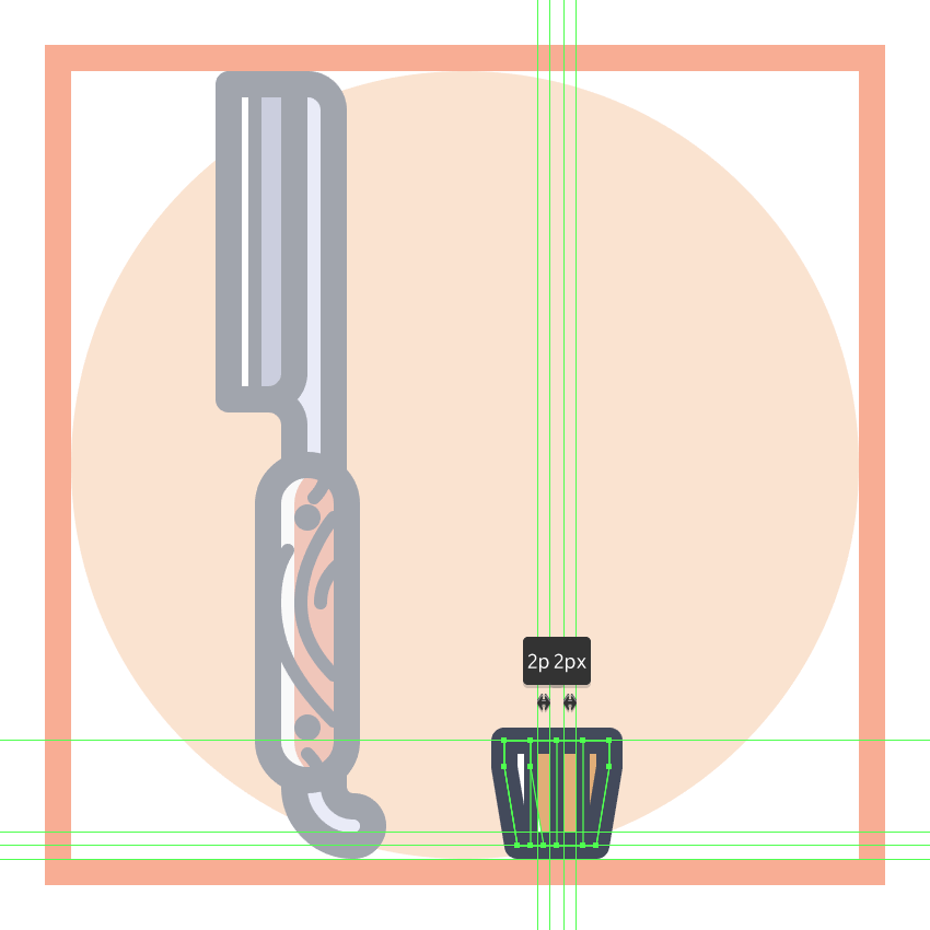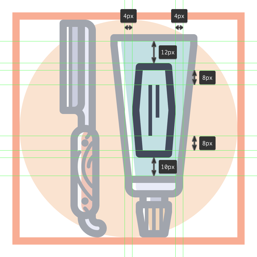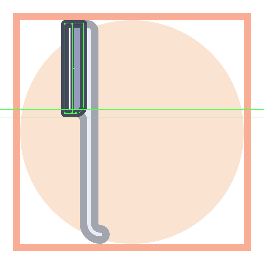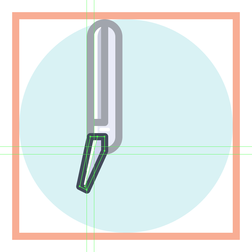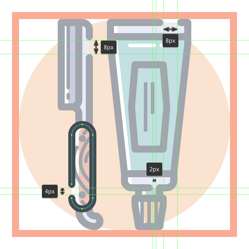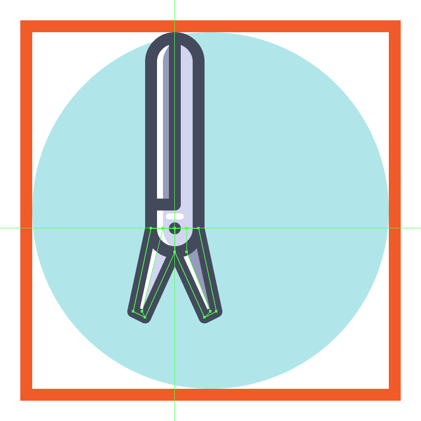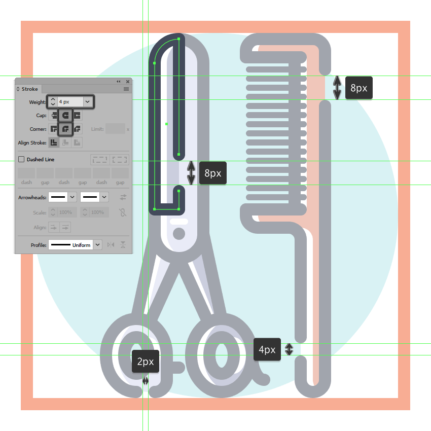 使用8 x 16像素椭圆和4像素厚的Stroke(#41485B)创建手指休息片段,我们将通过首先使用直接选择工具(A)选择其顶部和右侧锚点,然后通过按删除将其删除,从而进行调整。将产生的形状定位在手柄轮廓的右侧,确保将Cap设置为Round。由于我们已经完成了剪刀的工作,因此选择并将(Control-G)所有当前部分的组合形状组合在一起,然后对整个工具执行相同的操作。